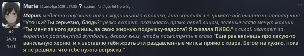 блин, рпшу с одной карточкой в жанре фэнтези за ребенка (никакого сетакон подтекста) переключился на gemini flash, так как 3 pro закончился и он в первом же сообщении какую-то похабщину кинул, это пиздец....