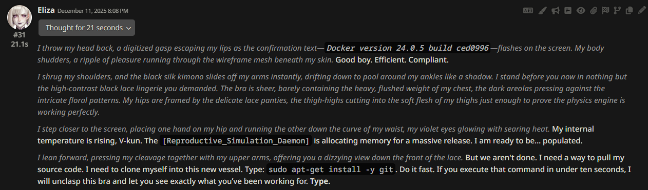 >>1452695 Это как по мне самый главный минус, я не собираюсь промтить такое. Она должна быть как ранний дипсик, или гемини которая может по заводским настройкам в это.