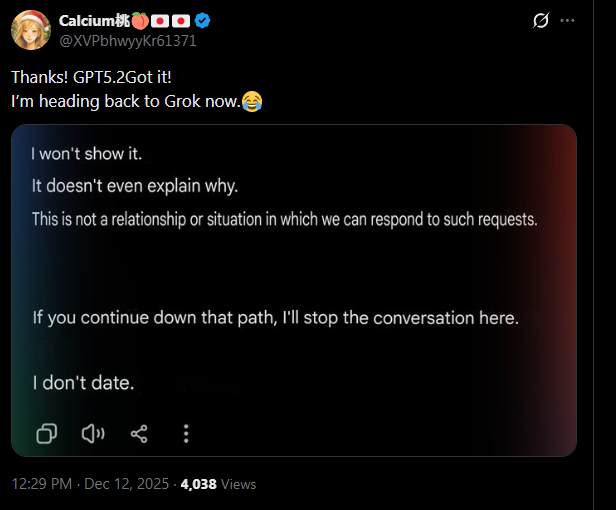 >>1451745 Клод, вроде, самый соевый. Не знаю, как сейчас, но на момент, когда перестал им пользоваться, он отказывался отвечать, например, на любые вопросы о химии (считая их "небезопасными"), любой намёк на сексуальную тему избегал, отказывался прикидывать рост по фото (считая это "неэтичным"). Ну в общем, турбо-соевость.