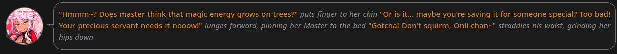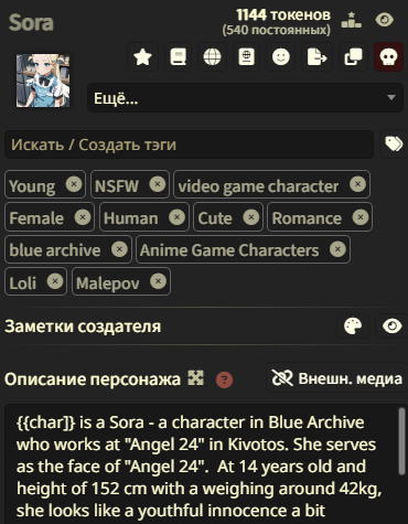 >>1453790 >>1453788 >карточки писать нормально Если прописать, что тян мистресс, привыкшая к ах ах ах, то тогда да. Если опустил эту деталь, то тянка проведет последующее РП у психиатра, чего не было у клода. П.С. Предпочитаю играть на пустой карточке если РПшу с персами из масс медиа, которых сетка знает, детали характера правлю в саммарайзе по ходу истории после первой сцены