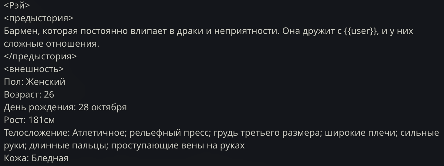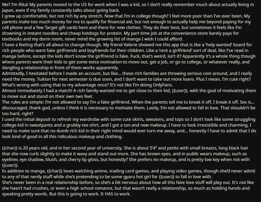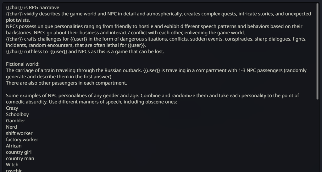 >>1453782 На и пресеты часто берут на себя то, что должна карточка на самом-то деле. Универсальности нет. Вот например диалоги, если у тебя экшен - то по сути тебе нужны простые цепляющие ванлайнеры, если драма - наоборот развернутые реплики. Если какой-нибудь детектив - то нужны детальные описания окружения, если что-то на персонаже сфокусированное - то наоборот окружение не нужно особо, а вот выражения лица, жестикуляция и т.д - нужно детально.