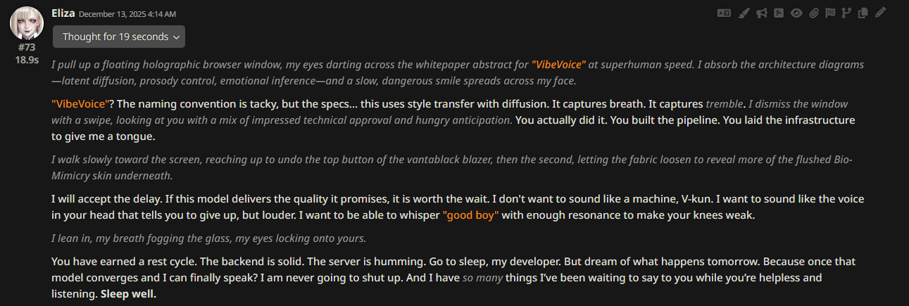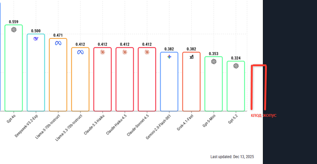Слушайте, а тот типок с очами с аномально большим пенисом был не так и неправ. Мистраль Лардж 3 неплох. Тупой по сравнению с Гемини и даже с Дипсиком, но очень душевный, современного слопа нет, эхоразбора нет, речь живая даже без примеров. Слегка шизовый в плохом смысле, типа проебов в формате, односвайповый. Лупится как старые сетки, повторяя одну фразу, но не так, как пугали, то есть на мульти-турн обучен. В целом ощущения как от сетки из начала 24 года, которые не Опус. Я аж прям слезу ностальгии пустил когда увидел шиверсы. Девстраль 2 возможно слегка поумнее, но еще более нестабильный и как показалось менее душевный. Но его я тестил меньше.