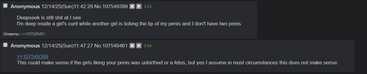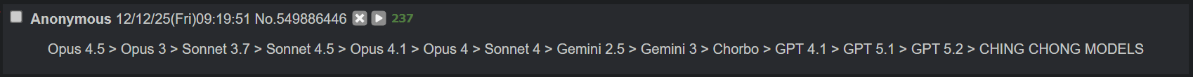 >>1453204 У меня есть личные карты которые сложные сеткам (несколько персонажей или запутанная предыстория и мотивация), Гемини 2.5 на них норм себя показывает, Дипсик обсирается. Также Дипсик обсирается в каких-то простых вещах как локалка из 23 года, типа подсчета денег, планирования ночевки и т.п. ситуаций где требуется на просто хуячить текст но и посмотреть на последние 4-8 последних сообщений, профиль персонажа и подумать. В целом мы на уровне я хуй знает июньского 3.5 Сонета (который был тупым односвайповым лупным соевичком) уже год сидим, у корпоратов сплошной регресс, у открытых моделей все еще безмозг. Тяжело. Я устал и разочарован.
