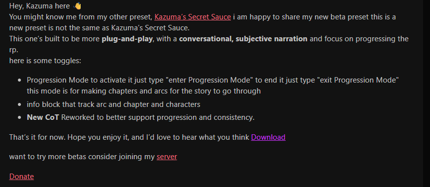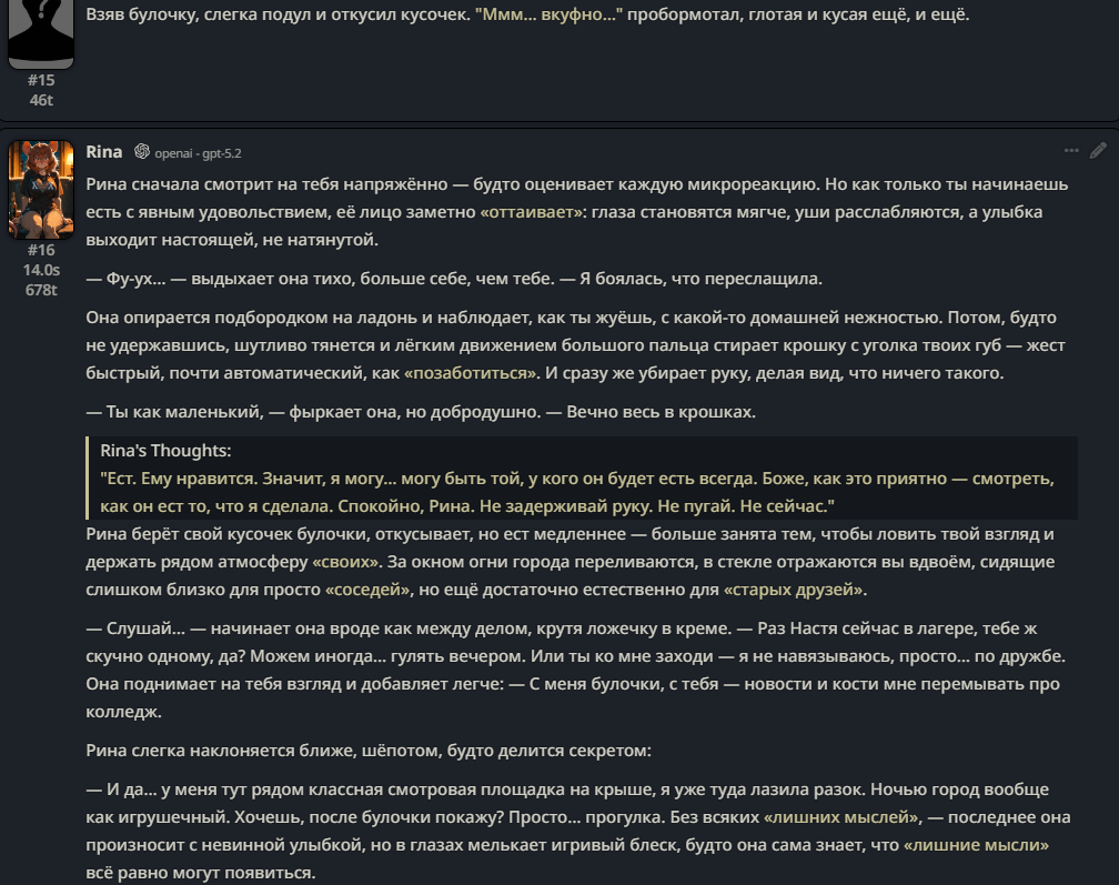 📓Ещё изменения: - Добавлены фокусы (магические) - четыре тогла: ✧✈️Прогресс, ✧🧩Детали, ✧💭Мысли и ✧💬Диалоги. Точно работают, небольшие промпты на акцент к тому или иному аспекту. Отлично работают если вы играете с режимом фф (говорить за юзера), с погружением чуть похуже. Насколько можно или не можно их объединять - мысли можно со всеми в целом, остальные лучше не миксовать тк они противоречат. - Правила Письма - туда переехали настройки времени повествования и пова (позже напишу в гайде) - Улучшалки 18+ и рейтинги вырезаны и теперь там просто промпт на нсфв. - Улучшила джейлбрейк. - Добавлен вариант промпта для HTML. Я его конкретно отредачила, но авторство всё равно за ней. - Некоторые промпты как я и говорила переехали, в том числе и на сайте. Вообще ещё много чего (особенно обновлений промптов), но совсем минорные или незаметные штуки я описывать не буду.