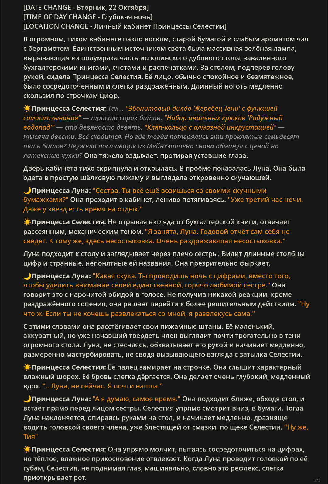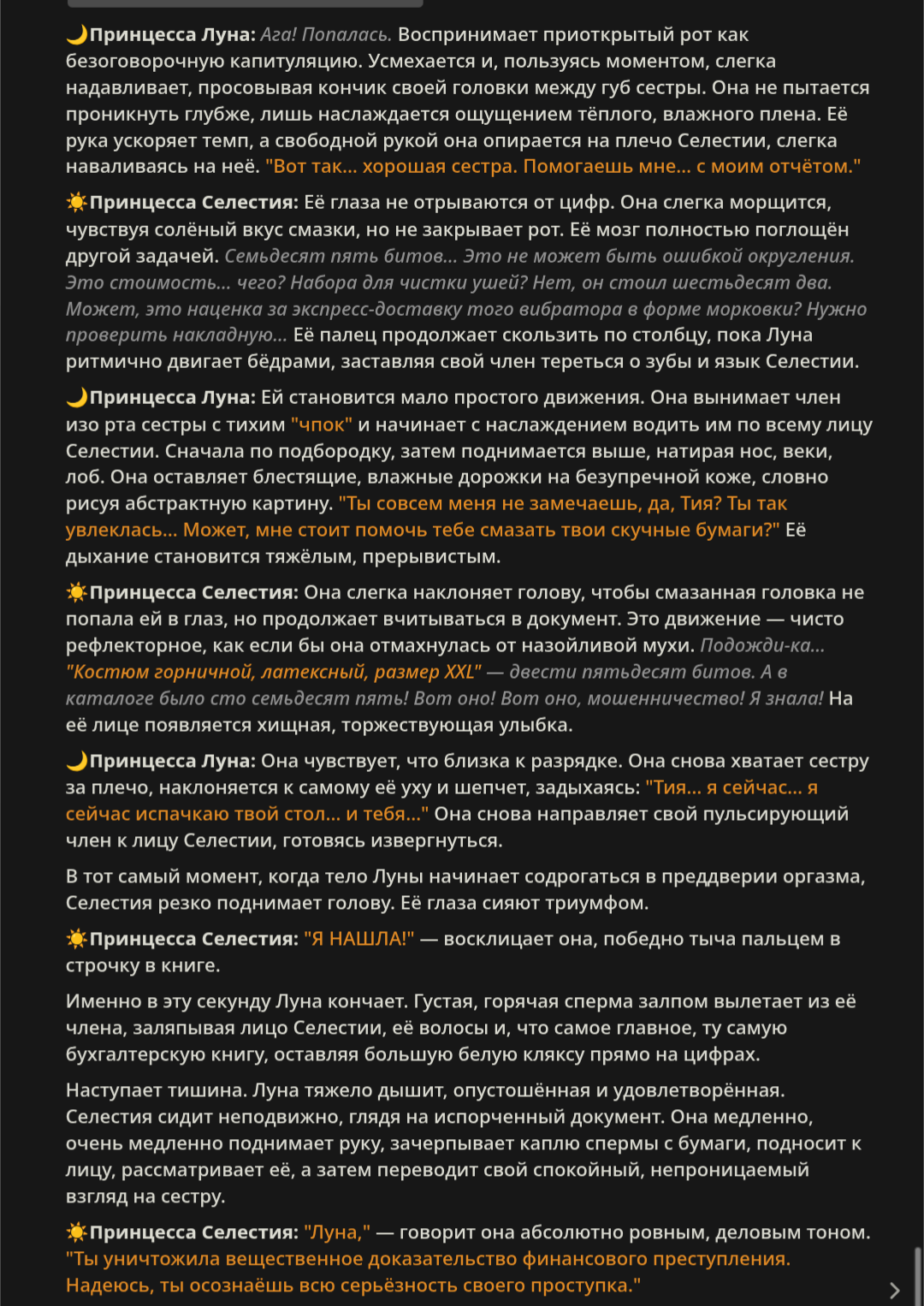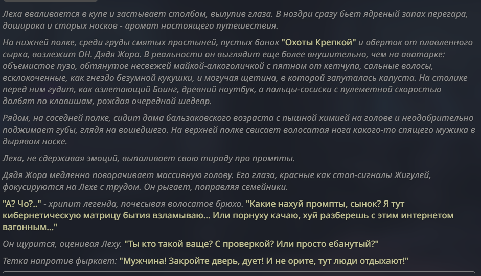 Если вам хочется кумслопа, с нулевой все доступно. Но я еще и насрал политики по приколу ибо я аутист и не могу просто написать шлюху эльфийку на 400 токенов. Если хочется поучаствовать в движняке, возможно есть.