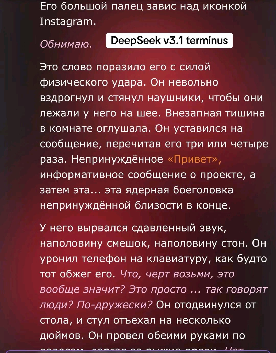 Дипсик определенно лучше гемини 3 на коротком контексте ~10-15к токенов. Креативнее, лучше кукает, лучше держит парик. Потом правда деградация и безмозг идет довольно резко.