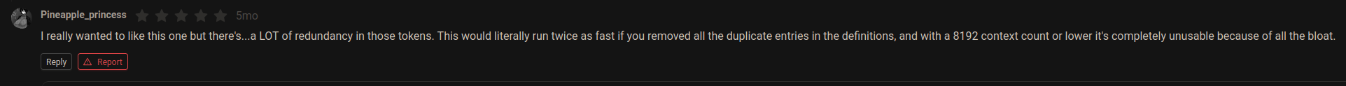 >>1455714 Да после вырезок все равно сообщений 40 край (пресет+аутпут+карточка+лорбук+саммари), и их тоже надо скрывать, выходит нихуя. 60к очень мало для гемини для чего-нибудь посложнее кума. Сотка предел понимания гемини, значит нужно 70-90.