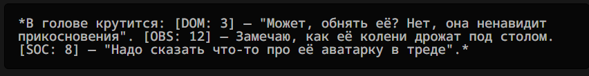 >>1455017 Гемини 3 про. и я хуй знает как задавать формат в этой карте, на момент старта нового чата нет никаких действующих персонажей, в гритинге описана сама хата и погода за окном. Я в первом сообщении отыгрываю как захожу в хату, потом в некст сообщении делаю таймскип до ночи, и тогда уже сетка спавнит моба (в данном случае бабу с канцелярским ножом) и начинает так ебано писать.