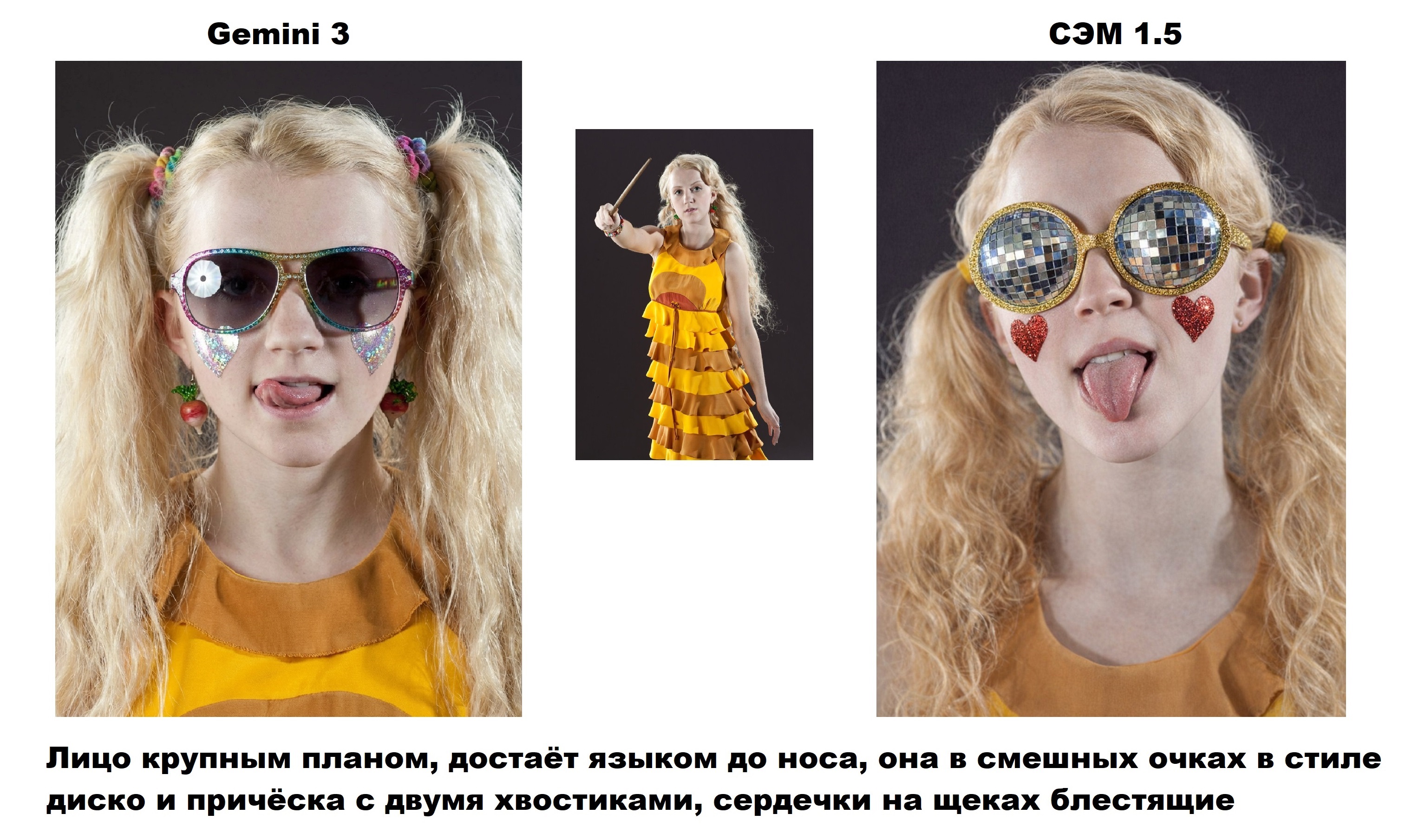 Пик 3: Тоже интересно, я попросил очки в стиле диско, и гпт восприняла это буквально, а может потому что я написал про "смешные". Ну очки слева смешными точно не назвать. гпт переврала цветовую гамму должен заметить, но рано делать выводы по одному результату запрос "языком достаёт до носа" не понимает ни одна модель, и в этот раз тоже революция не произошла