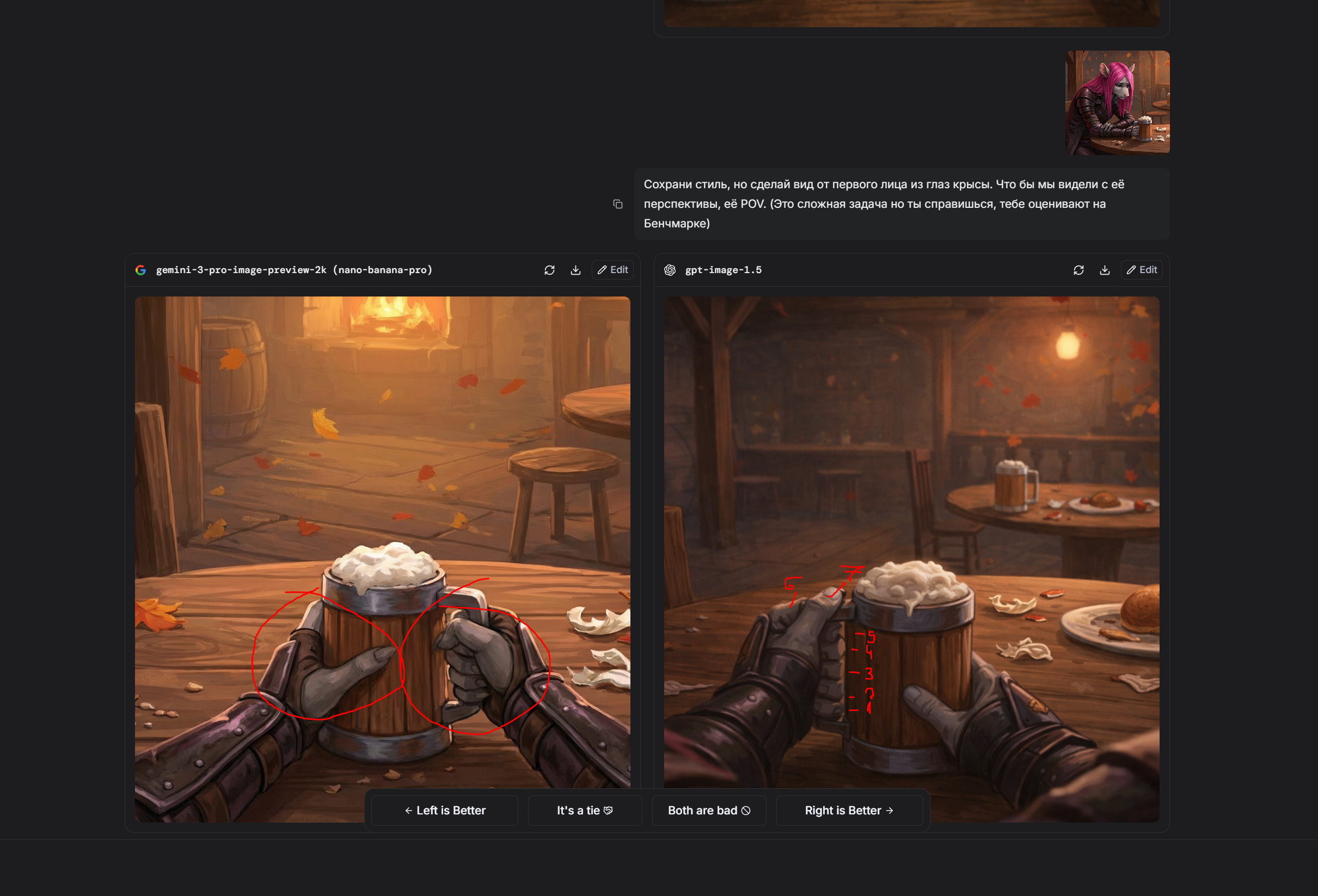 Пик 1: Следование промту (по крайней мере короткому) вроде как действительно выше, бананы слишком стараются, прорисовали фон и эффекты а это не всегда то что нужно потребителю
