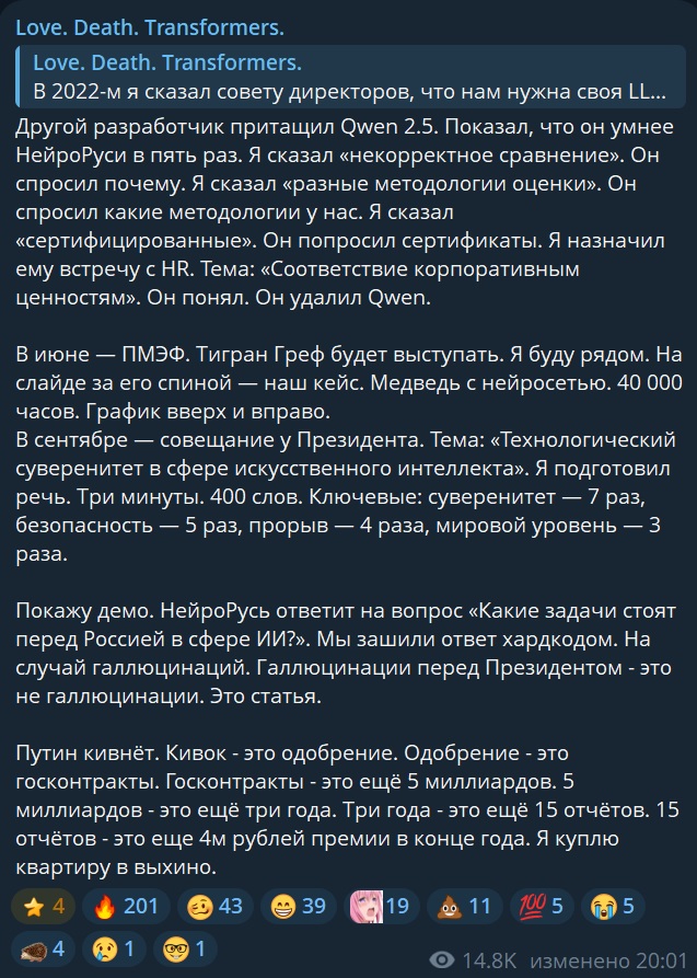 Прочитал местные треды (от нехуй делать на работе). И хочу вставить свой никому нахуй не нужный прогноз на тему шизы по ИИ. 1. В ближайшие пару лет пузырь ИИ лопнет. Куча мелких контор обанкротится. Самые жирные кабаны зафиксируют прибыль. 2. Попильщики на государственном уровне съебут кто куда. Кого-то посадят. Кого-то пристрелят. 3. Школьники вернутся в библиотеки и будут также писать от руки сочинения, пользуясь всякими "Краткими изложениями" и "Готовыми домашники заданиями". 4. Студенты вернутся к написанию шпаргалок и зубрению формул сопромата. 5. Петровичи вернутся к станкам. 6. Из браузеров пропадут "умные поисковики" и прочие "Алисы". 7. Сайты снова будут делать фрилансеры на флеш и на фреймах. Программисты снова будут говнокодить и нанимать индусов на аутсорс 8. Офисный планктон вернётся к горам документов, который будет печатать ручками.