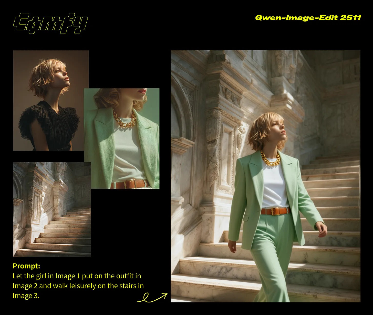 Попробовал qwen edit 2511. Похоже они его сломали. Что локально, что на сайте. Качество изображения хуже: мыльное, двоится. Про его нововведения сказать не могу так как бросил тесты от огорчения.