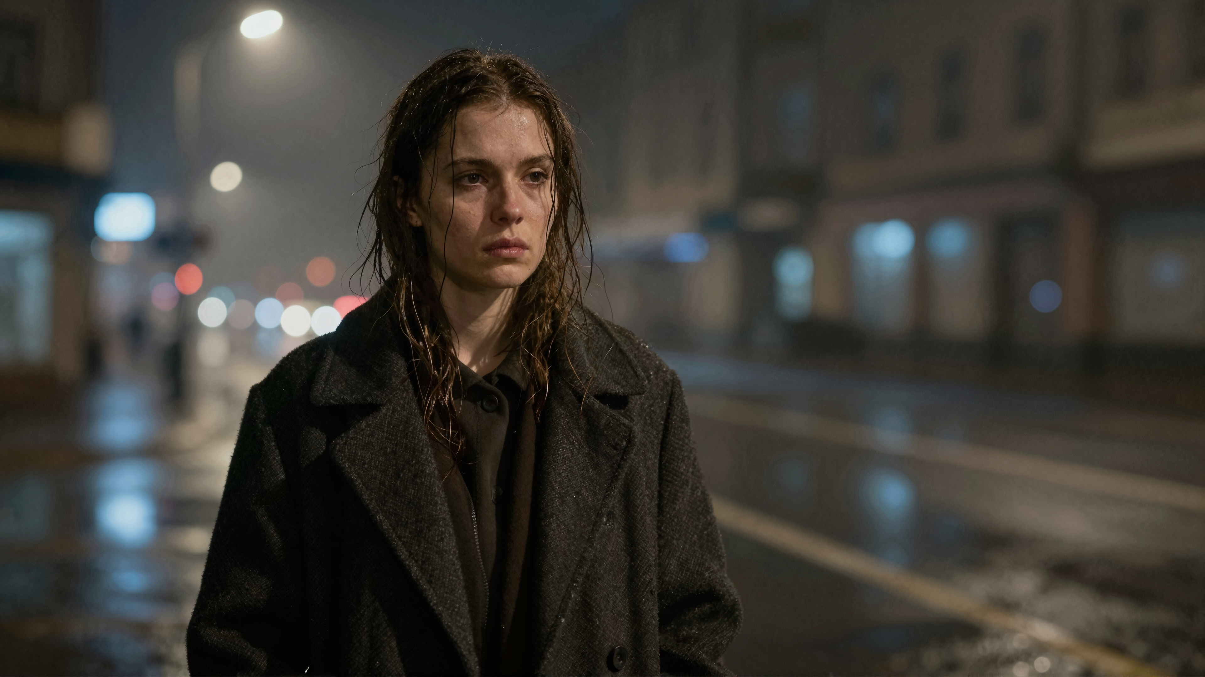 Девушка в домашнем халате с чашкой чая стоит на балконе хрущёвки ранним осенним утром, наблюдая, как двор оживает: дети идут в школу, пенсионеры выгуливают собак, а её отражение едва видно в запотевшем стекле. Россия, осень, свинцовое небо