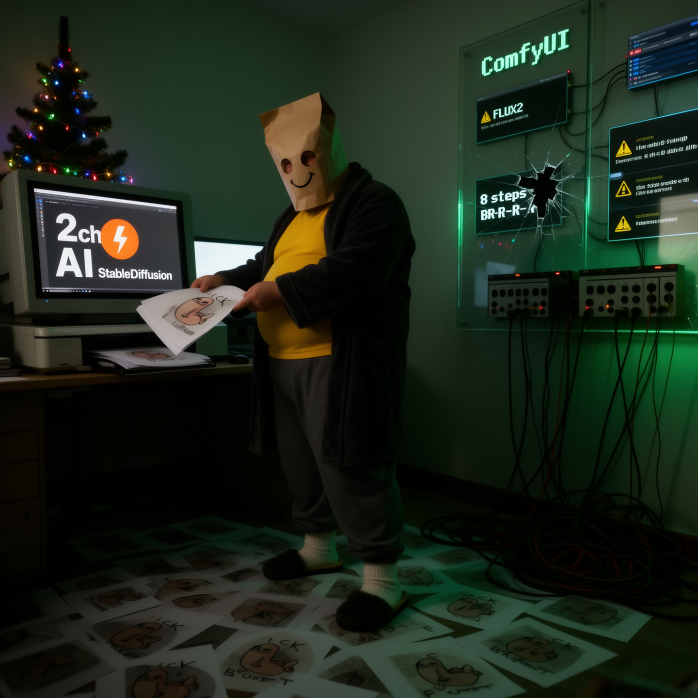 Ещё FLUX.2 с задатками Edit-манипуляций с элементами изображений, работой с reference images и различными стилями. Жирная (если меньше 128 Гбайт RAM, лучше не трогать, сбережёшь SSD и нервы), медленная (вышедшая вчера LoRA на 8 шагов ситуацию не исправляет, так как теряет детали композиции), требует определённого подхода к составлению JSON-promptов, если хочется чего-то с обилием деталей на генерации. Публика без железа её не жалует. При определённом подходе позволяет делать пикрилы.