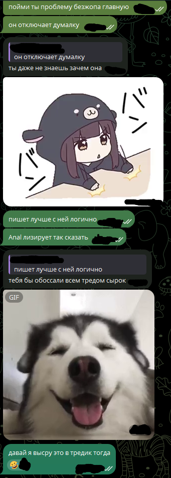 Бля мне надо перерыв от вас брать. Сегодня ночью приснился кошмар: там мои логи прочитал какой-то проксихолдер и ему прям не понравилось. Причем я рпшил не дегенератство, а просто бессмысленный слайс. Так вот он во сне мои логи в тред запостил, потом вычислил меня ИРЛ, сдеанонил в тред и все пизда... правда в конце сна стал понимать, что это бред какой-то и проснулся. Но ощущения такие поганые от сна, ощущение постоянной паранойи и слежки...