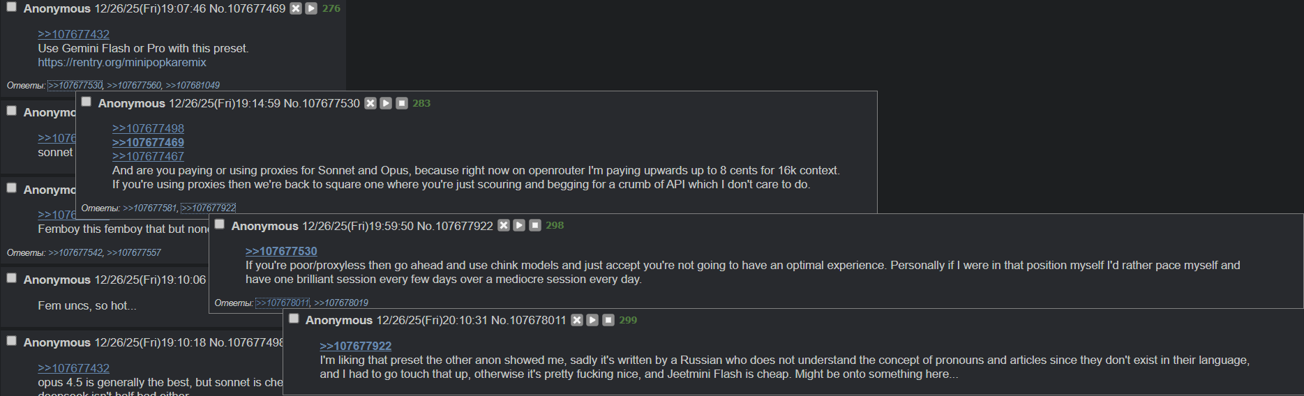 >>1470808 >2 юшки на посте с логами на опус 4.5 Оскорбление игнорированием. В каком нормальном треде игнорят логи RP-SotA сетки? >что там блять оценивать? Как сетка отыгрывает персонажей, как работает с окружением, множеством персонажей, как держит характер, как описывает эро и эччи сцены, качество русского языка, веришь ли ты в происходящее после прочтения. Много чего можно оценить, было бы желание. >ты лучше думай о пресете своём А что с пресетом не так? >какое нахуй мемо ??? Ты о чём?