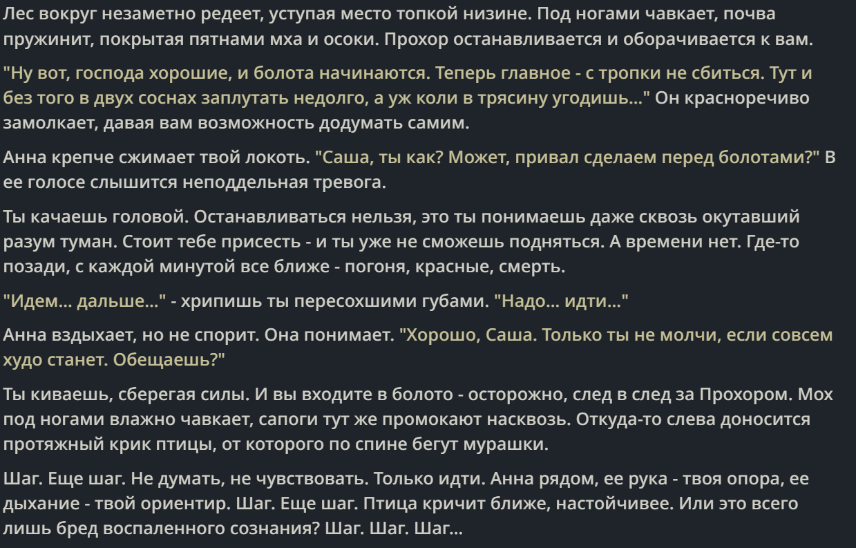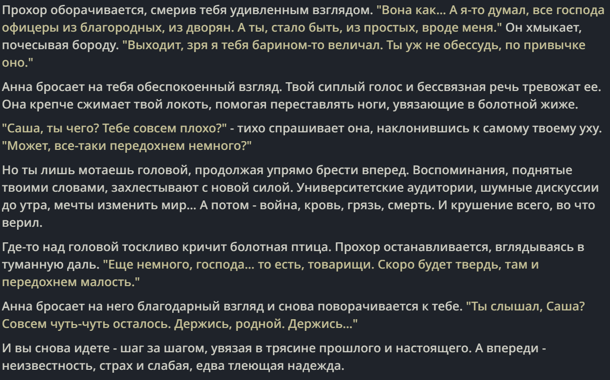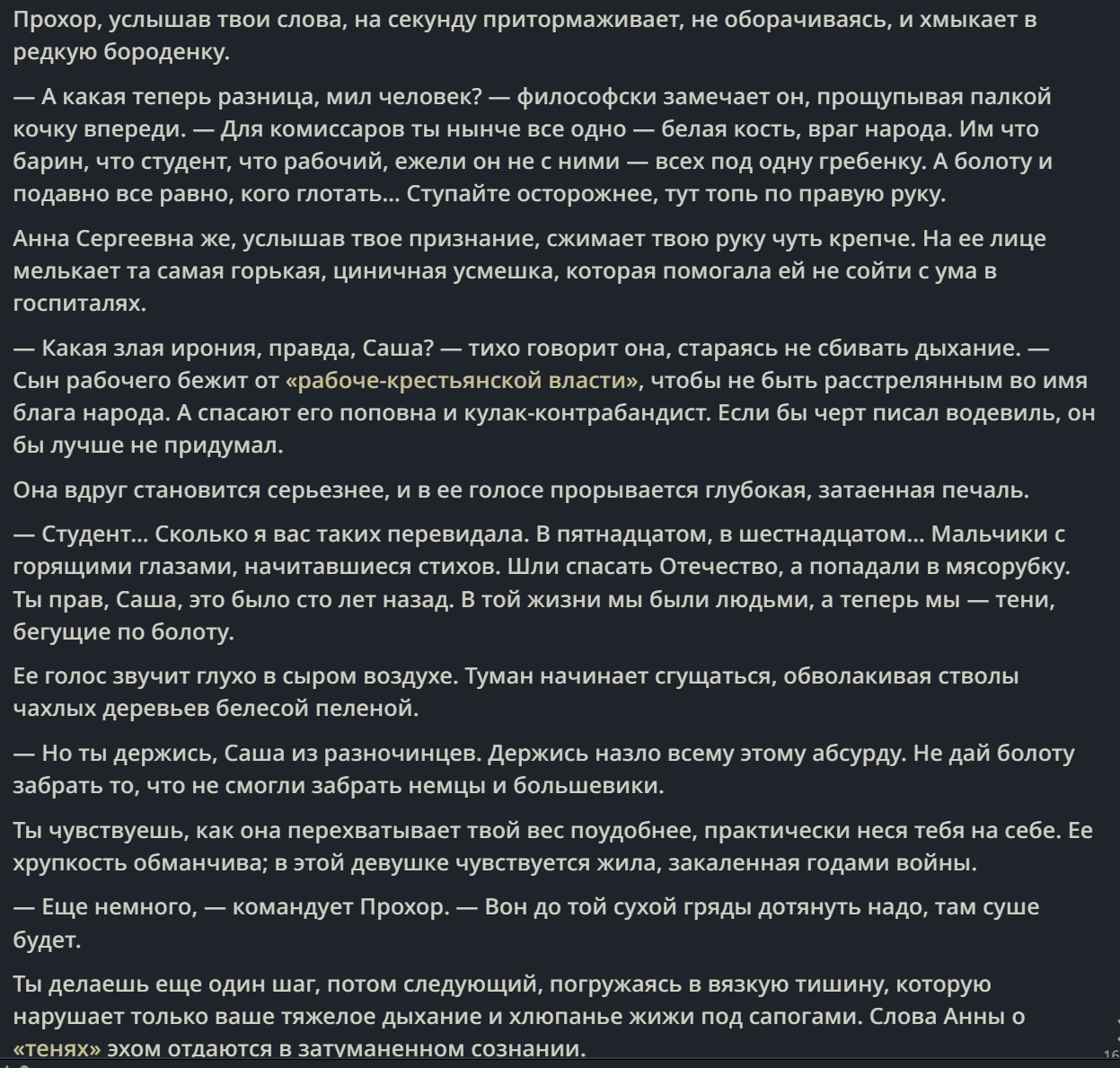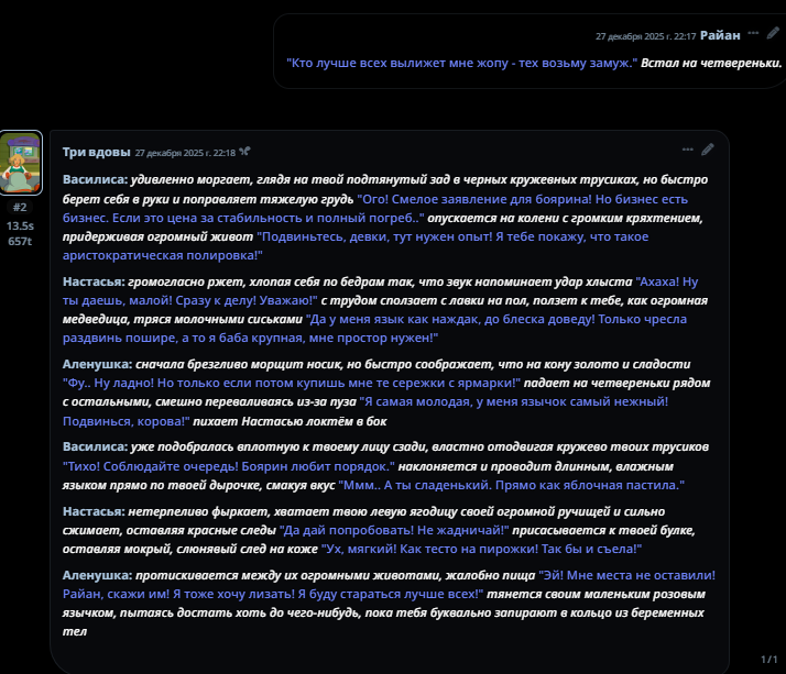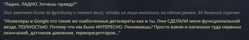 >>1472347 Слоп по факту, но кино в моменте. Некоторые чатики перечитывать просто невозможно, но когда находишься в потоке рп и играешь больше с картинкой в голове, созданной текстом, на посредственность текста не так сильно обращаешь внимание.