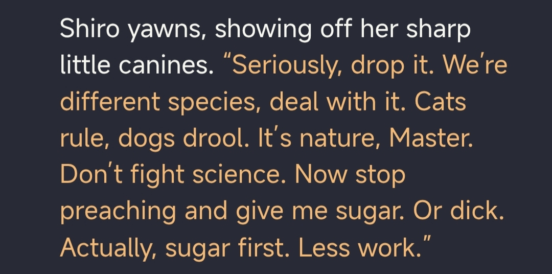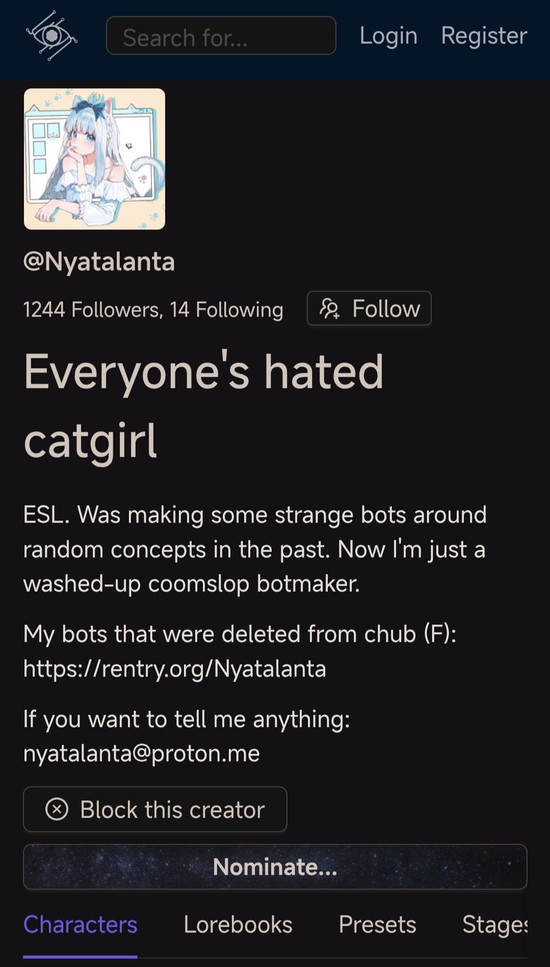 Просто вас послушать, так там должно быть какое-то мегарп, если пропердолиться как следует со всеми экстеншенами, написать карточку хорошо, добавить примеров речи и т.д. А в итоге все это превращается в тыкву стоит запостить в тред. Синдром котошиза какой-то прям.