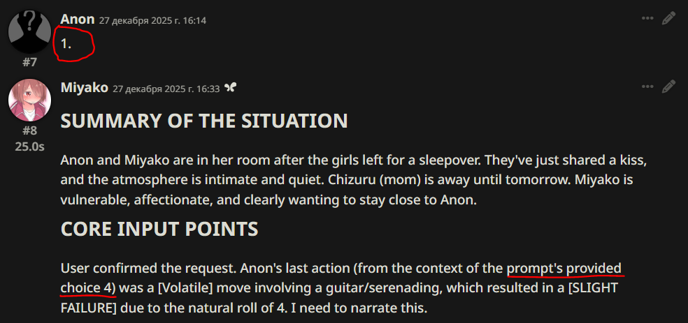 >>1470888 Анончик, я например свои промпты тестирую очень скрупулёзно, и если пощу то с оговорками как менять если вылезет эдж кейс. Вот например лог где-то выше запостили, на пресете который с виду выглядит как говно. >>1470581