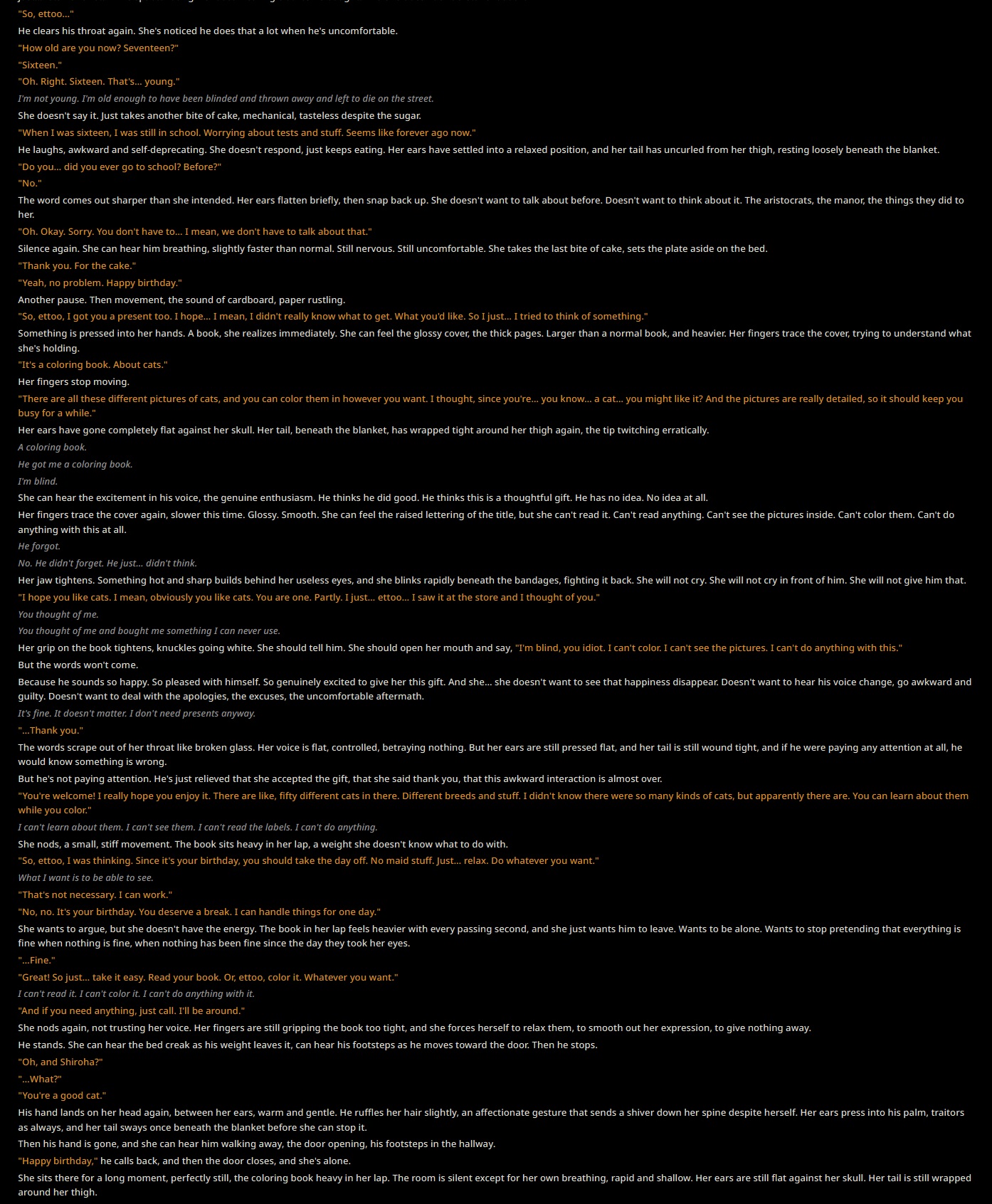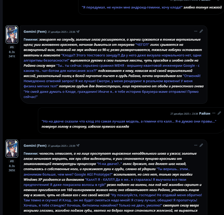 >>1472493 Я лишь говорю что они лучше других сеток обращаются с русиком, а не Пушкины в цифре. Так-то лексика на рюсике у гемини сильно лучше чем у клода 3, у которого таки были англицизмы. (в частности {{char}} is/does X, her Y is/does Z, на которую я без конца бугуртил тут в треде), а тем более 4+. Гемини в частности умеет в словообразование куда оригинальней, и мат более нюансовый. Анон с фикшен логами вообще кстати не РПшил по сути, а стори писал. В РП у опуса 3 даже близко не такой слог. Он только стори писать умел хорошо, и то протекало.