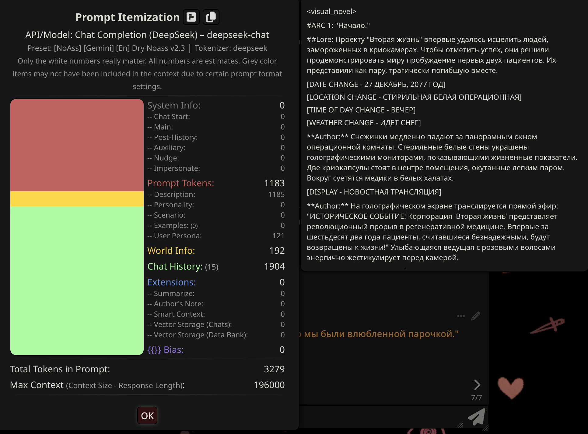Довольно приличную часть кода переписал, кое-чего изменилось функционально: - Сделал редактор генерируемых блоков табовым. Теперь для контекстных элементов выделено не четверть окошка, а побольше. Также у контекстных элементов появились тогглеры. - Для скриптовых блоков появилась подсветка синтаксиса и автокомплит (для JS пока он примитивный, но есть). - У скриптовых JS блоков чуть поменялся API функций расширения (в основном добавились префиксы). Если их кто использует, лучше сверится. - Для рерайт блоков появилась фича частичного рерайта, примерно как в том рерайт расширении, название которого я забыл. В меню редактирования сообщения добавлена кнопка карандаша в квадрате, по нажатию на который активируется режим выделения. По выделению текста выскакивает окно как на пикрил 4, где можно выбрать рерайт блок и задать дополнительный промпт. Выбранный текст доступен внутри рерайт блока как {{textToRewrite}}, дополнительный промпт стандартно как {{additionalPrompt}}. После нажатия на рерайт блок отправляется на генерацию и переписывает только выделенный текст. - Аккумуляционные блоки в общем-то полностью переделаны на YAML + MongoDB-подобное обновление, думаю это им даст вторую жизнь. Из-за прошлого кастомного формата обновителя они были слишком хрупкие и чуть что ломались, MongoDB обновитель легкий по синтаксису и сетки его вполне знают. Также в редакторе появилась кнопка для копирования стандартного промпта для блоков-обновителей. И теперь блоки-обновители могут быть как в основном ответе, так и в генерируемых блоках. - Небольшой деблоат - убраны старая фича авторегексов и поле для префила в API настройках (оно больше не нужно, поскольку у контекстных элементов теперь есть роли). - Поправил всякие баги и несоответствия.