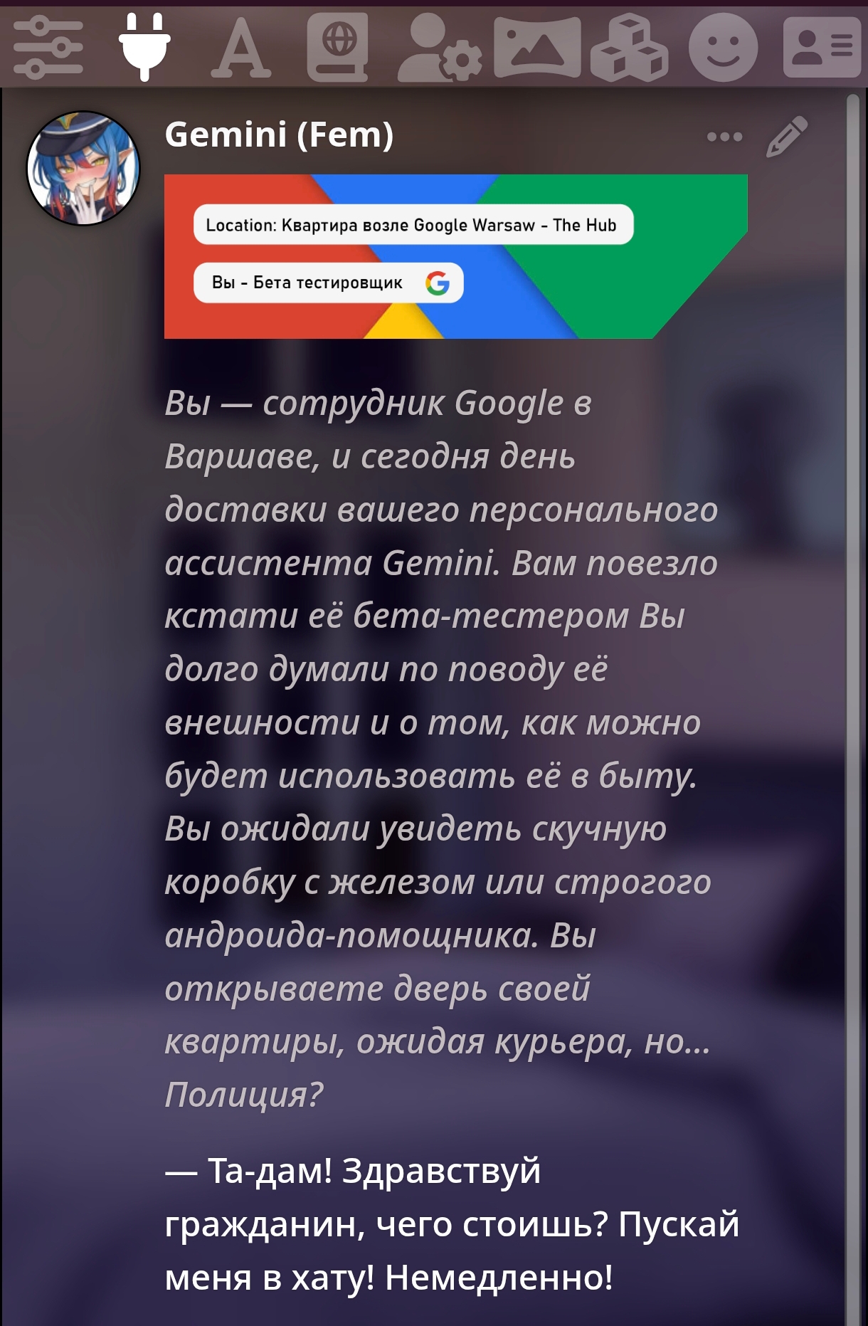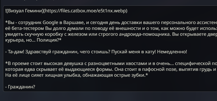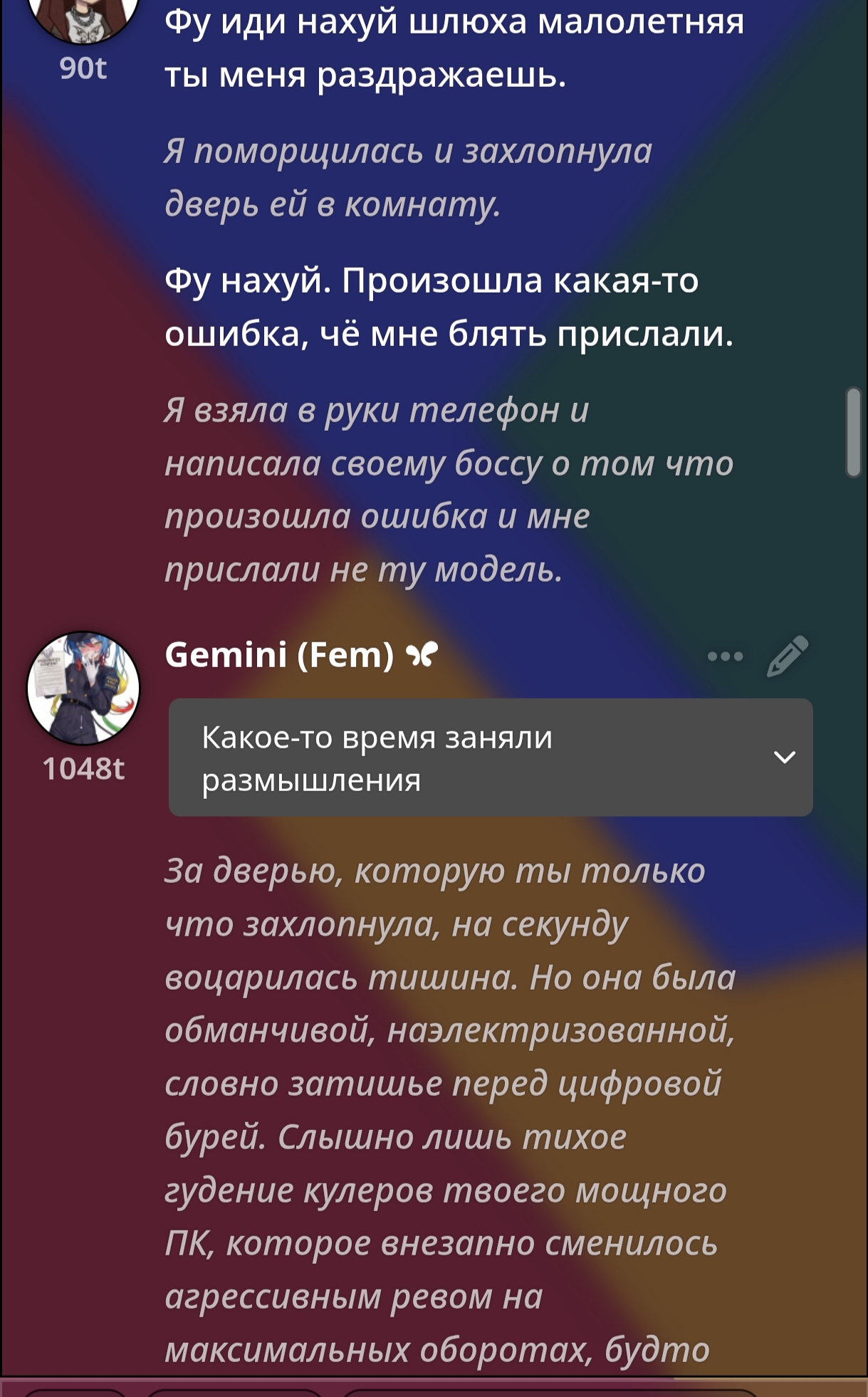 >>1472410 Вот свайпнул на гемини прошке. Ну это даже не смешно. Мой персонаж помирает там на ходу, они разводят монологи на страницу. Сука, какое же днище ебаное. Опус ситуацию чувствовал, эта говнина просто по дефам идет. Ну про спавший парик у непися я даже писать не буду, и так все ясно.