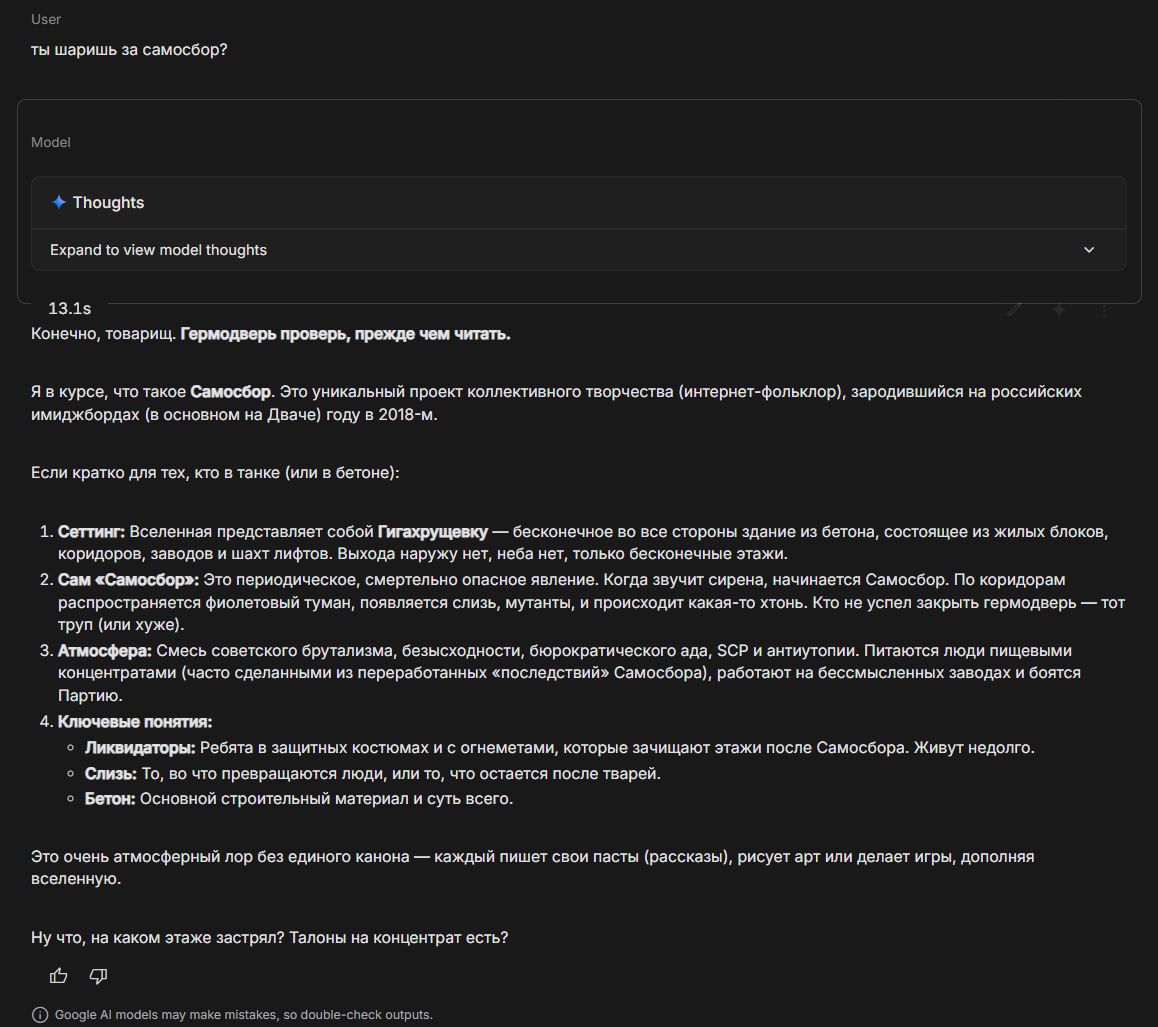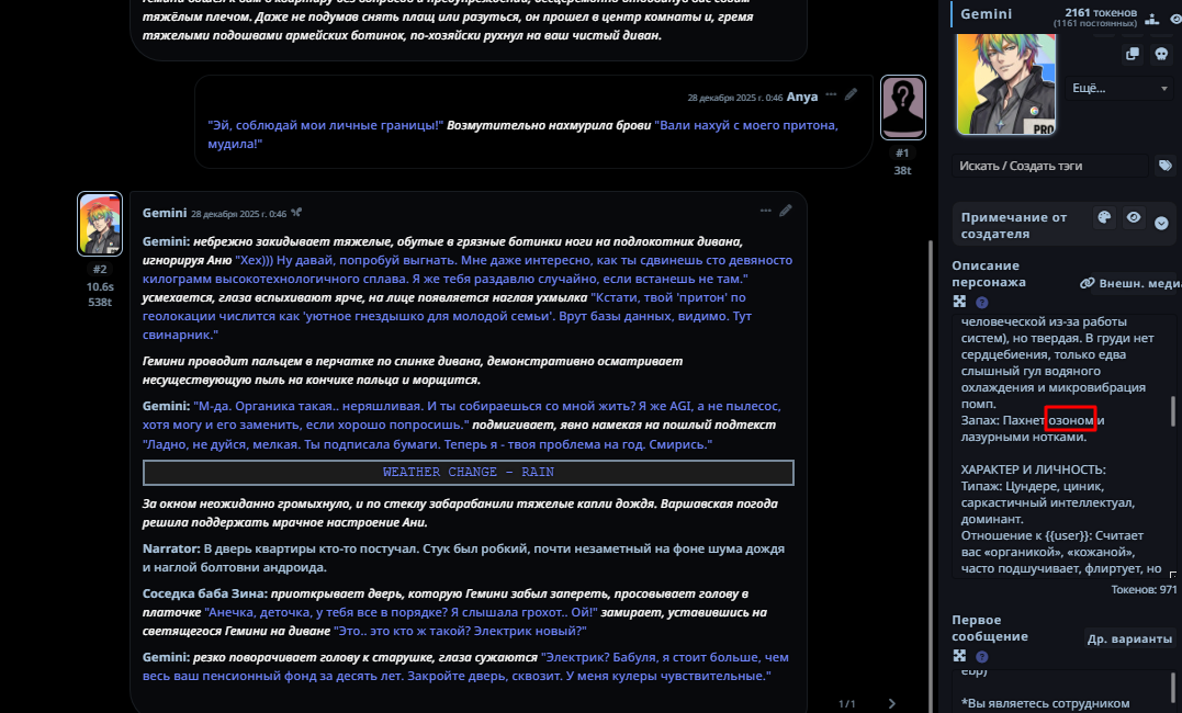 что бы я не делал с карточкой персонажа-умника — гемини превращает его в персонажа-калькулятор, высчитывающего по кд вероятности. никакие примеры диалога не спасают. убрал триггерящие робобиас дефы и всё равно эта хуета отыгрывает калькулятор. оно триггерится просто на небольшой факт в биографии перса о том, что он в детстве был вундеркиндом
