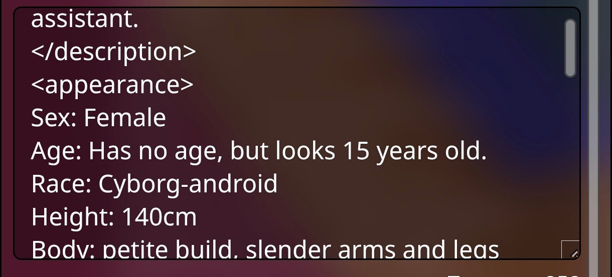 >>1472144 История твоего протычка не интересна, сори >>1472145 >если он нужен только ботоделу Он нужен еще и сетке, которая его жрет, а тут ей 5к токенов противоречащих дефов насыпают (в случае шуподевок - буквально противоречащих, лол). Про мемо и примеры умалчиваю. Гритинги я обычно один хуй под себя переписываю поэтому тут похуй, но >All `<speech_examples>` only serve as general guidelines хоть теги бы закрывал при упоминании, типа `<speech_examples></speech_examples>`, от незакрытого тега любой хмл-формат уедет по пизде, откуда сетке знать что ты это имеешь в виду как отсылочный пример а не как корневую разметку