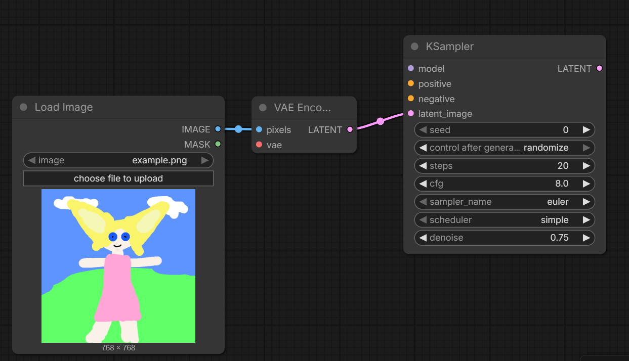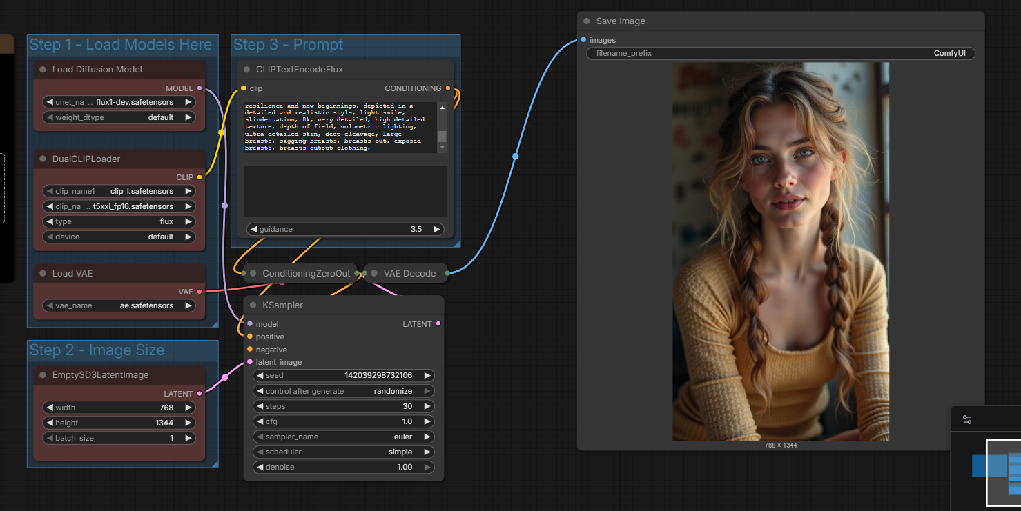 >>1476274 >Реально не могу, потому что не понимаю логику построений под необходимый процесс Что именно тебе непонятно? Вот самый простой темплейт эвер для сдохли с прошлого треда, что тут неясно? Все пайплайны конструируются точно также - составные части модели с нодами для их загрузки, узлы с лорами, узлы промтинга, узел семплера, декодинг, могут добавляться специальные ноды для сборки видео если модель допустим для видео или на инпут картиночек ноды если i2i/i2v. Примитив же!