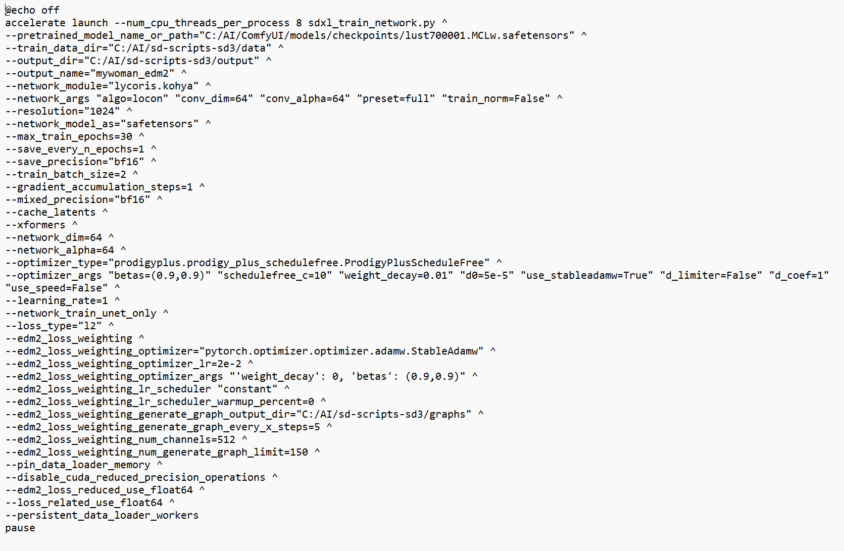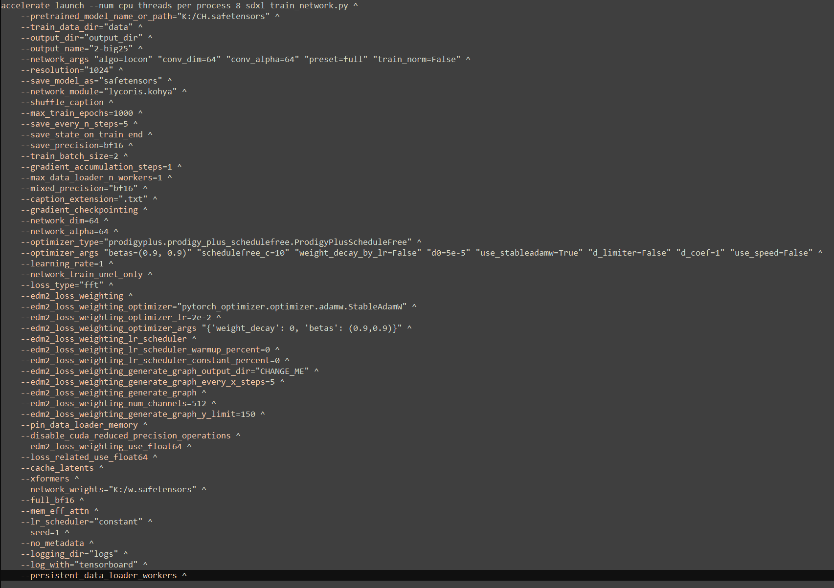 --network_model_as="safetensors" — не существует в этом форке (это флаг из старого kohya-ss/sd-scripts для SDXL). --edm2_loss_weighting и все связанные с ним флаги (--edm2_loss_weighting_optimizer, --edm2_loss_weighting_lr_scheduler и т.д.) — не распознаются (это кастомные флаги, которых нет в скрипте или они сломаны/не реализованы). Скрипт выводит usage (список поддерживаемых аргументов), где нет--network_model_as, --edm2_loss_weighting и многих других из твоей команды.