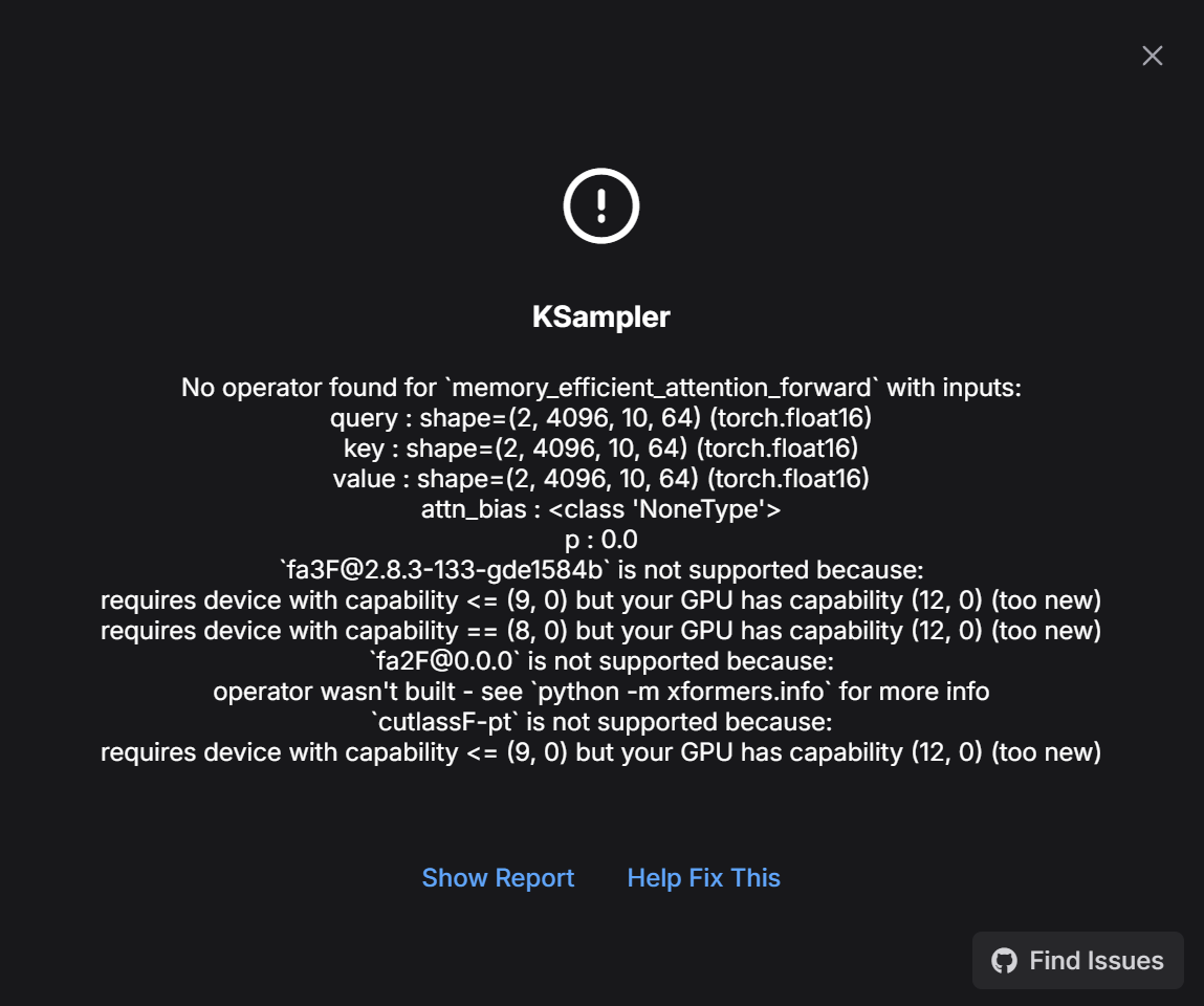 >>1483449 Вот так крашится (фотки схавал) Traceback (most recent call last): File "C:\AI\sd-scripts-sd3\sdxl_train_network.py", line 213, in <module> trainer.train(args) File "C:\AI\sd-scripts-sd3\train_network.py", line 910, in train model_version, text_encoder, vae, unet = self.load_target_model(args, weight_dtype, accelerator) File "C:\AI\sd-scripts-sd3\sdxl_train_network.py", line 60, in load_target_model vae.set_use_memory_efficient_attention_xformers(args.xformers) File "C:\AI\sd-scripts-sd3\.venv\lib\site-packages\diffusers\models\modeling_utils.py", line 394, in set_use_memory_efficient_attention_xformers fn_recursive_set_mem_eff(module) File "C:\AI\sd-scripts-sd3\.venv\lib\site-packages\diffusers\models\modeling_utils.py", line 390, in fn_recursive_set_mem_eff fn_recursive_set_mem_eff(child) File "C:\AI\sd-scripts-sd3\.venv\lib\site-packages\diffusers\models\modeling_utils.py", line 390, in fn_recursive_set_mem_eff fn_recursive_set_mem_eff(child) File "C:\AI\sd-scripts-sd3\.venv\lib\site-packages\diffusers\models\modeling_utils.py", line 390, in fn_recursive_set_mem_eff fn_recursive_set_mem_eff(child) File "C:\AI\sd-scripts-sd3\.venv\lib\site-packages\diffusers\models\modeling_utils.py", line 387, in fn_recursive_set_mem_eff module.set_use_memory_efficient_attention_xformers(valid, attention_op) File "C:\AI\sd-scripts-sd3\.venv\lib\site-packages\diffusers\models\attention_processor.py", line 425, in set_use_memory_efficient_attention_xformers raise e File "C:\AI\sd-scripts-sd3\.venv\lib\site-packages\diffusers\models\attention_processor.py", line 423, in set_use_memory_efficient_attention_xformers _ = xformers.ops.memory_efficient_attention(q, q, q) File "C:\AI\sd-scripts-sd3\.venv\lib\site-packages\xformers\ops\fmha\__init__.py", line 311, in memory_efficient_attention return _memory_efficient_attention( File "C:\AI\sd-scripts-sd3\.venv\lib\site-packages\xformers\ops\fmha\__init__.py", line 472, in _memory_efficient_attention return _memory_efficient_attention_forward( File "C:\AI\sd-scripts-sd3\.venv\lib\site-packages\xformers\ops\fmha\__init__.py", line 491, in _memory_efficient_attention_forward op = _dispatch_fw(inp, False) File "C:\AI\sd-scripts-sd3\.venv\lib\site-packages\xformers\ops\fmha\dispatch.py", line 142, in _dispatch_fw return _run_priority_list( File "C:\AI\sd-scripts-sd3\.venv\lib\site-packages\xformers\ops\fmha\dispatch.py", line 83, in _run_priority_list raise NotImplementedError(msg) NotImplementedError: No operator found for `memory_efficient_attention_forward` with inputs: query : shape=(1, 2, 1, 40) (torch.float32) key : shape=(1, 2, 1, 40) (torch.float32) value : shape=(1, 2, 1, 40) (torch.float32) attn_bias : <class 'NoneType'> p : 0.0 `[email protected]` is not supported because: requires device with capability <= (9, 0) but your GPU has capability (12, 0) (too new) dtype=torch.float32 (supported: {torch.bfloat16, torch.float16}) requires device with capability == (8, 0) but your GPU has capability (12, 0) (too new) `[email protected]` is not supported because: dtype=torch.float32 (supported: {torch.bfloat16, torch.float16}) operator wasn't built - see `python -m xformers.info` for more info `cutlassF-pt` is not supported because: requires device with capability <= (9, 0) but your GPU has capability (12, 0) (too new) Traceback (most recent call last): File "C:\Program Files\Python310\lib\runpy.py", line 196, in _run_module_as_main return _run_code(code, main_globals, None, File "C:\Program Files\Python310\lib\runpy.py", line 86, in _run_code exec(code, run_globals) File "C:\AI\sd-scripts-sd3\.venv\Scripts\accelerate.exe\__main__.py", line 7, in <module> File "C:\AI\sd-scripts-sd3\.venv\lib\site-packages\accelerate\commands\accelerate_cli.py", line 50, in main args.func(args) File "C:\AI\sd-scripts-sd3\.venv\lib\site-packages\accelerate\commands\launch.py", line 1281, in launch_command simple_launcher(args) File "C:\AI\sd-scripts-sd3\.venv\lib\site-packages\accelerate\commands\launch.py", line 869, in simple_launcher raise subprocess.CalledProcessError(returncode=process.returncode, cmd=cmd) > у тя не портабл чтоли? Да вроде нет, ну в браузере запускаю через павершел python main.py