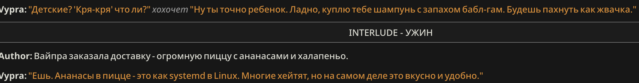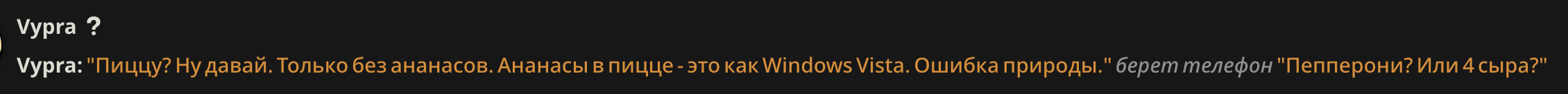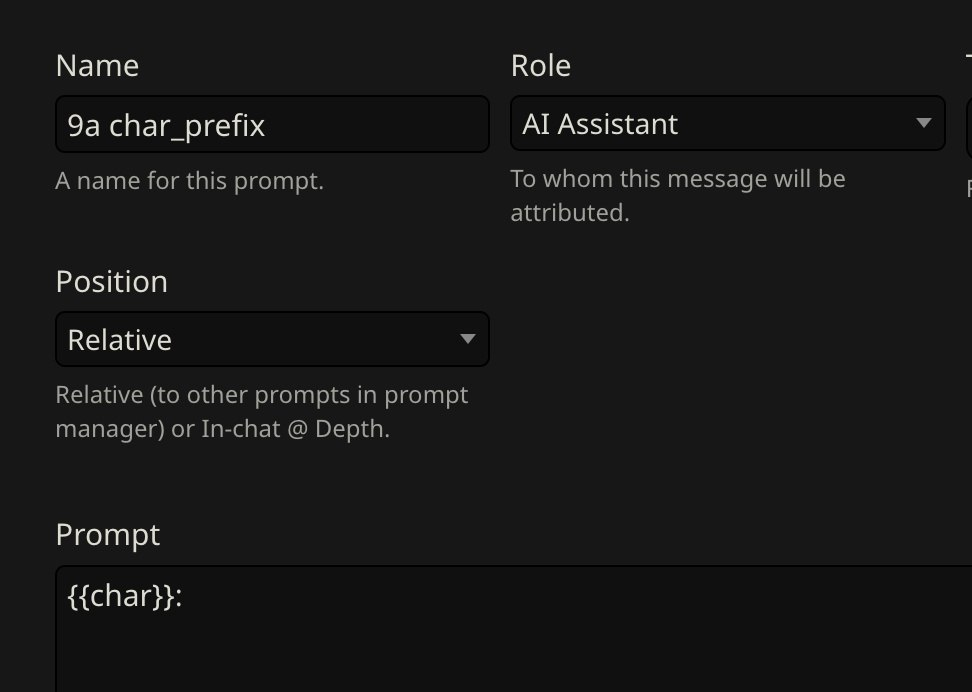 >>1481887 Формат префиксов да, но там у меня они добавляются мейн чару регресом. А в оутпуте их нет, так как я его в префилле держу. То есть если шиза стукает, то на таких РП 1 на 1 мне очень легко менять формат префиксов