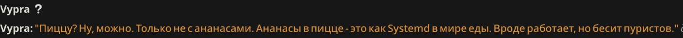 >>1482352 В консоли целое нихуя. Я сменил промт с соляночника на ремиксера и стал наконец ответы выдавать. Что за нахуй мне не понятно, ибо даже до фурриебства не дошел