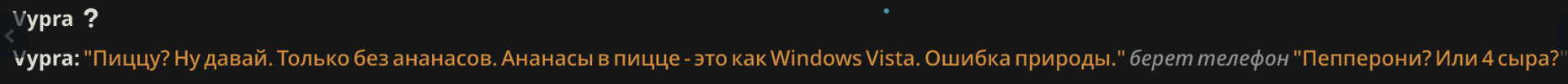 >>1482112 Ну там довольно специфично. Отыгрываю сцену, где персонажи делают небольшой полукомедийный сговор на средневековом рынке. Вся элементарная арифметика монет на допсетках, глму все в максимально пережеванном виде подается. И он мало того, что слишком рано и нелогично раскрывает сговор через протечку секретов (этого еще можно было ожидать), так умудряется еще и обосраться с однозначными цифрами и хронологией. Ну и к этому добавляется постоянная протечка знаний между персонажами, хотя в думалке уделено внимание кто что знает.
