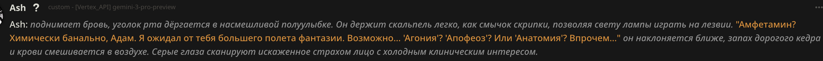 У меня другая проблема. Все модели добрые 😔. Мне нравится гемини 3, и клоды хорошие. Но я скучаю по стеклу...не могу заставить их играть стекло как мне надо. Слишком уступчивые. Нет газлайтинга, манипуляций и жести как в 2.5. но 2.5 слишком негативный. И этот слоп надоевший уже до ужаса... Щас пресеты все делают на экономию токенов, особенно с появлением тройки. А они точно не решают мою проблему