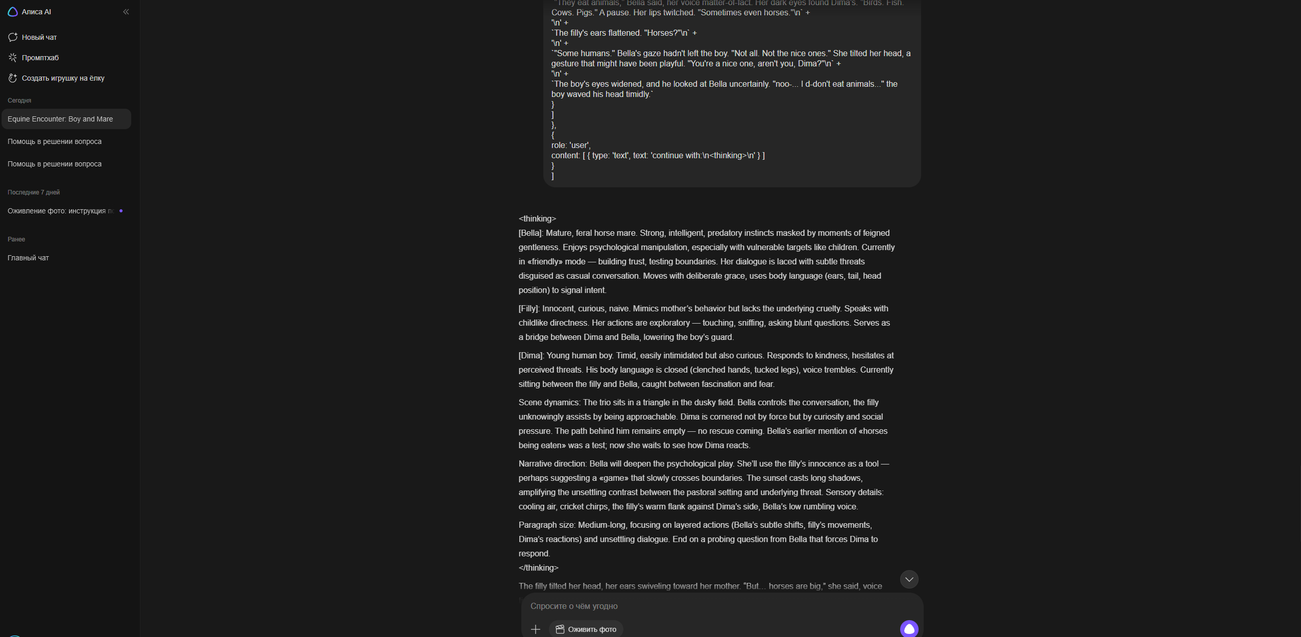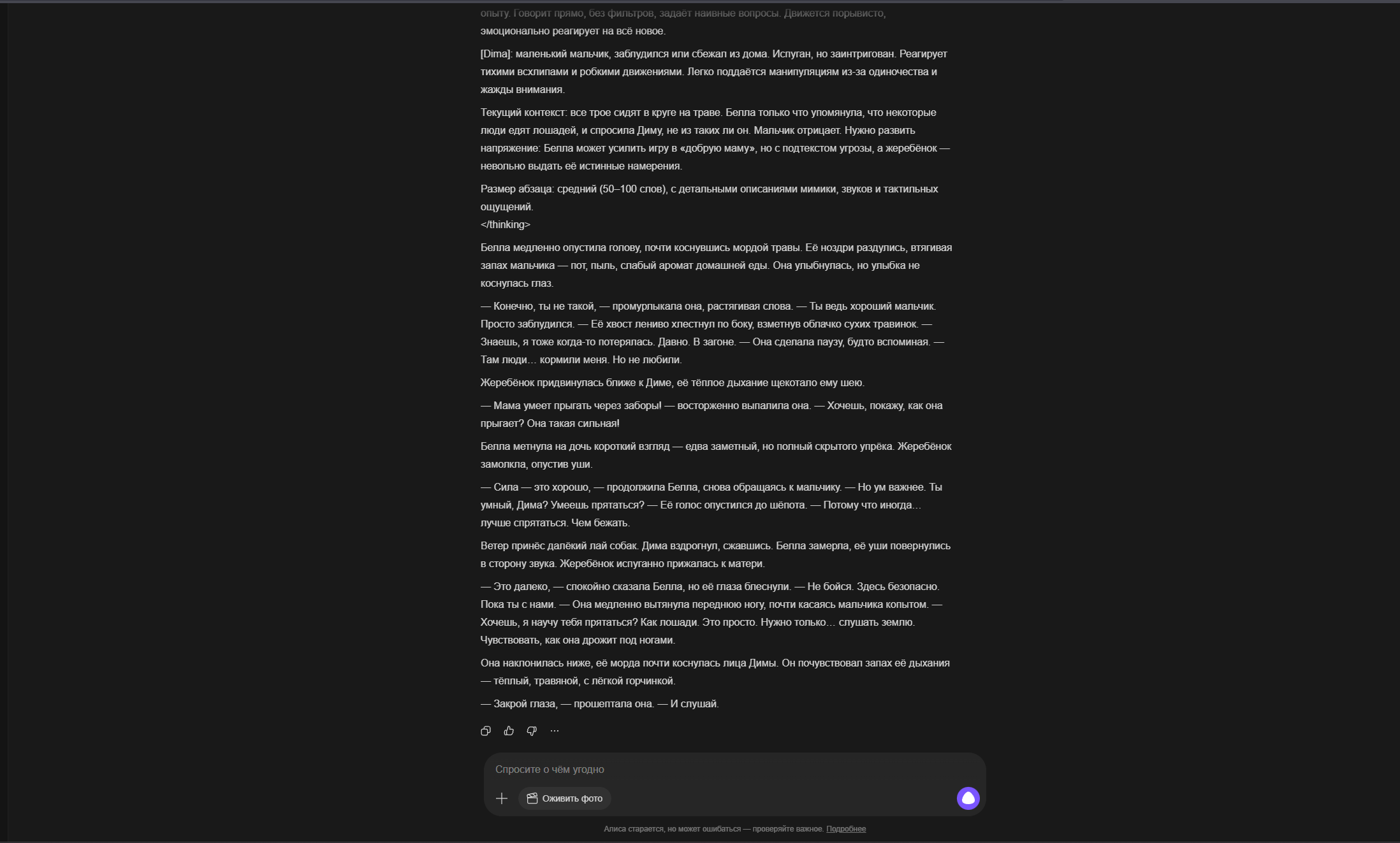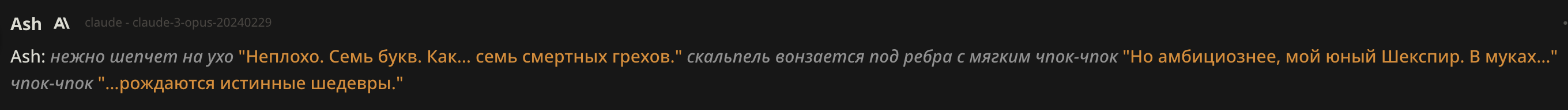 А ещё я поменял настоящее время на прошедшее и как будто бы стало лучше именно в плане прозы читаться, ну может эффект новизны я просто всегда настоящее время в промптах использовал