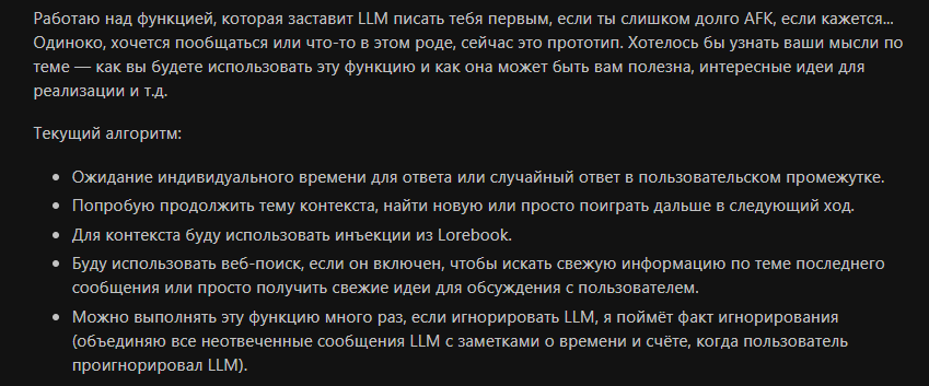 >>1482310 Давай. >>1482292 Мы и так делаем, с внешними блоками. Таверна упирается только в невозможность параллельных вызовов. И да, это пиздец как долго и жрёт дохуя, а добавляет мало чего. Агентов для РП дохуя кроме таверны, толку мало.