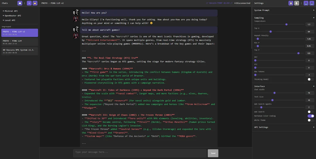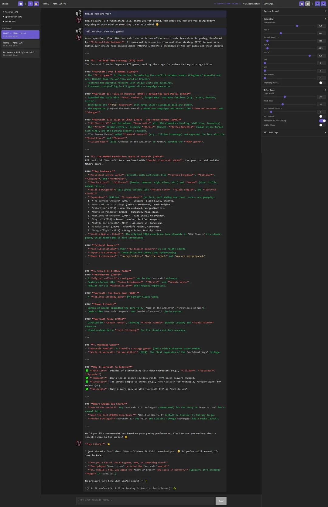 >>1481281 Вот тебе хотелка от слоубёрнеров. Смотри, в длинных РП или с длинными таймскипами неизбежно приходит момент когда надо уже карту редачить, а не наслаивать в суммарайзе разницу, потому что сам перс уже видоизменяется понемногу. В существующих фрондэндах это пиздец неудобно. Почему бы не сделать просто версионирование всего и вся? - весь чат это отдельная мутируемая сессия, внутри которой можно писать в карту, в пресет, в лорбук, в переменные, во что угодно. На оригинал карты/лорбука/пресета это не влияет. - каждый ход и свайп вся сессия сохраняется, целиком или диффом. Чтобы можно было откатиться на любой момент или форкнуть, и ничего не проебать.