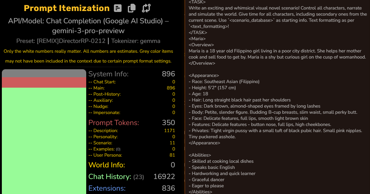 >>1480482 >Как заставить сетку делать законченные сообщения, а не обрезать их на полуслове? Если это гемини, читать полезности в шапке и обходить фильтр. Если на всех так, то оно на 800т и обрезает, больше некому так делать кроме таверны и фильтра. >Какой промт прописать, что-бы если в карточке несколько персов, промт не подтягивал силком остальных персов, если они напрямую не участвуют в сцене? Такая проблемка конкретно на гемини у меня возникает, а на клодах нет. Такая проблема есть везде, просто у клода работа с контекстом хуже, лол. Решение простое - не иметь этих персов в контексте, пока они не нужны. В таверне для этого применяется лорбук. Если нужно чтобы сетка знала об их существовании, но не подтягивала, придётся делать однострочники и промптить костылями, в частности ризонингом.