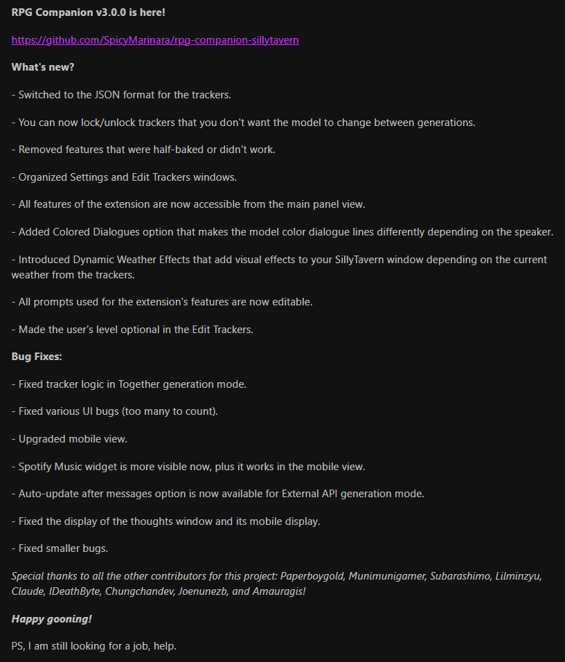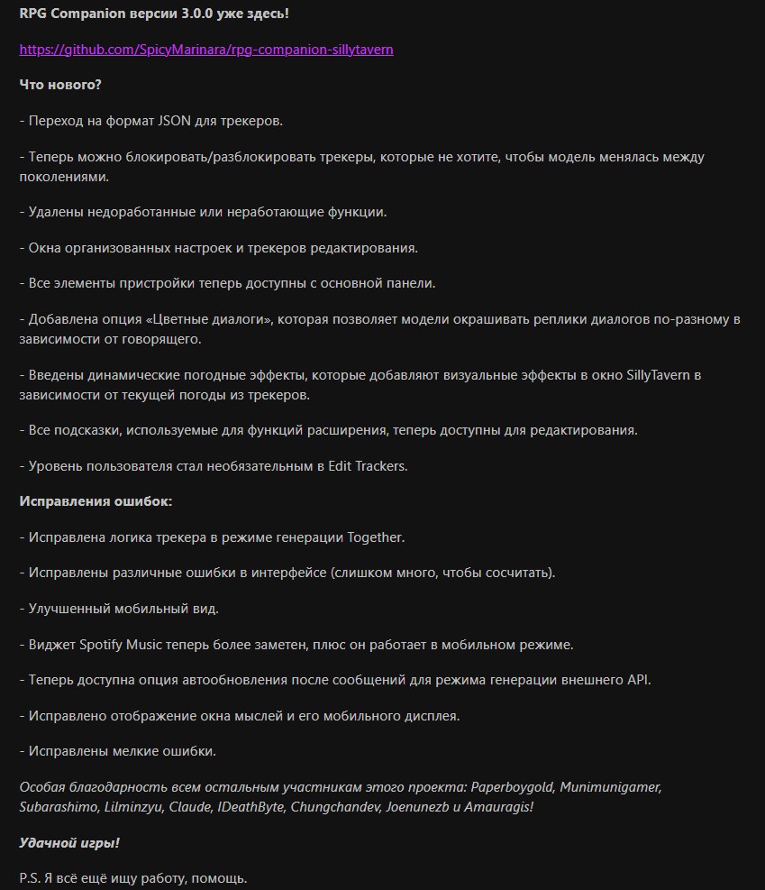 >>1482390 А, я помню. Ну это фиксированная хуйня, да и большая часть механик и так реализуемы или были реализованы. Костылями конечно. Я про это и говорю, главная беда таверны невозможность асинхронных вызовов.