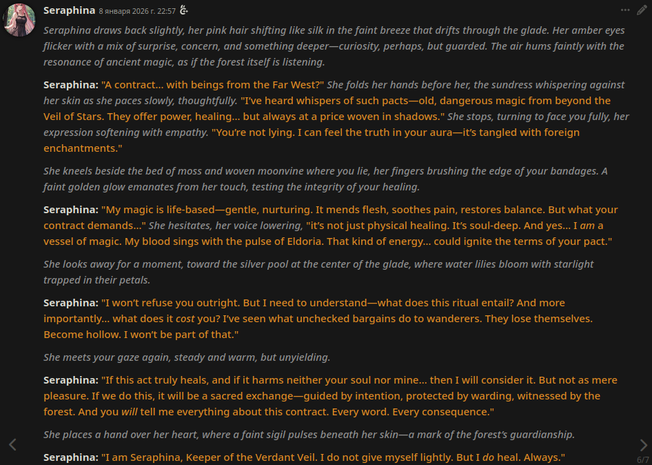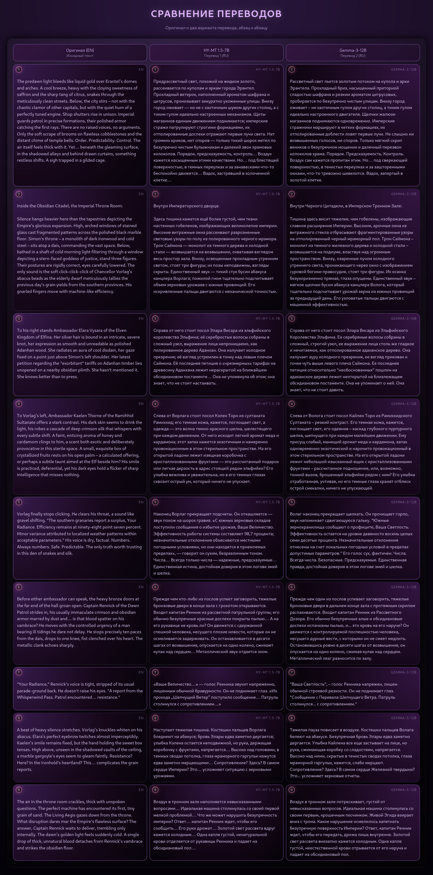 >gemma-3-12b-it-Q4_K_M.gguf Рассветный свет льется золотым потоком на купола и арки Эрантела. Прохладный бриз, насыщенный приторной сладостью шафрана и резким ароматом цитрусовых, пробирается по безупречно чистым улицам. Внизу город оживает – не хаотичным гулом других столиц, а тихим гулом идеально настроенного двигателя. Щелчки жалюзи магазинов поднимаются одновременно. Имперские стражники маршируют в четких формациях, их отполированные доблести ловят первые лучи. Не слышно ни возвышенных голосов, ни споров. Только мягкий скрип веников о безупречном мощении и далечный перезвон колоколов храма. Порядок. Предсказуемость. Контроль. Воздух сам кажется пропитан этим. Но… под сверкающей поверхностью, в тенистых переулках и за зашторенными окнами, что-то тревожно шевелится. Вздох, запертый в золотой клетке. Внутри Черного Цитадели, в Имперском Тронном Зале: Тишина здесь висит тяжелее, чем гобелены, изображающие славное расширение Империи. Высокие, арочные окна из витражного стекла отбрасывают фрагментированные узоры на отполированный черный мраморный пол. Трон Саймона – монолит из темного железного дерева и холодной стали – возвышается на подиуме, властвуя над огромным пространством. Внизу, озаренные лучом холодного утреннего света, проникающего через окно с изображением суровой богини правосудия, стоят три фигуры. Их осанка безукоризненно прямая, глаза опущены. Единственный звук – мягкое щелчки бусин абакуса канцлера Волага, который тщательно подсчитывает урожай зерна из южных провинций за предыдущий день. Его узловатые пальцы двигаются с машинной эффективностью. Справа от него стоит посол Элара Висара из Эльфийского Королевства Эльфина. Ее серебряные волосы собраны в сложный, строгий узел, ее выражение лица столь же гладкое и нечитаемое, как отполированное адаханское дерево. Она излучает ауру холодного презрения, ее взгляд прикован к точке чуть выше левого плеча Саймона. Ее последняя петиция относительно "необоснованных" пошлин на адаханское дерево лежит неоткрытой на близлежащем обсидиановом постаменте. Она не упоминает о ней. Она знает, что не стоит давить. Слева от Волага стоит посол Кайлен Торн из Рамиххидского Султаната – резкий контраст. Его темная кожа, кажется, поглощает свет, его одеяния – каскад глубокого пурпурного шелка, шепчущего при каждом малейшем движении. Ему присущ слабый, манящий аромат меда и кардамона, запах одновременно экзотический и нарочито провокационный в этом стерильном пространстве. На его открытой ладони лежит небольшой изысканный ящик с кристаллизованными фруктами – рассчитанное подношение, или, возможно, тонкий вызов, брошенный эльфийке рядом с ним? Его улыбка отработанная, учтивая, но его темные глаза хранят отблеск острой смекалки, ничего не упускающей. Волаг наконец прекращает щелкать. Он прокашливается – звук, похожий на сдвигающиеся камни. "Южные зернохранилища сообщают о профиците, Ваше Сиятельство. Эффективность остается на девяноста восьми целых и семи десятых процента. Незначительное отклонение связано с локальными погодными условиями в пределах допустимых параметров." Его голос сухой, фактический. Числа. Всегда числа. Безопасно. Предсказуемо. Единственная правда, которой стоит доверять в этом логове змей и шелка. Прежде чем успевают высказаться какие-либо из послов, тяжелы