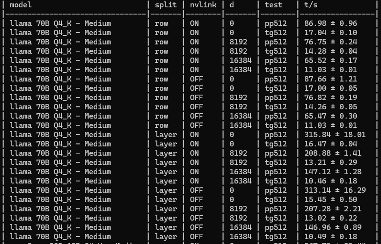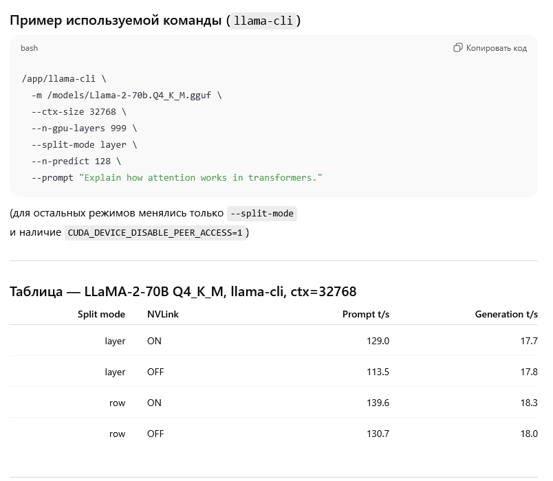 Найди пожалуйста модель на 33-60 ГБ, чтобы она влезала только на две карточки сразу - и сравни какая скорость с nvlink и с программно выключенным nvlink. Вот эти два режима со скриншота. Если в pipeline split я ещё верю, на одну "прокрутку" через трансформер только в одном месте передать условный мегабайт текущих значений активации, то вот в tensor split так что прям при расчёте слоя обмен идёт - уже как-то не очень.