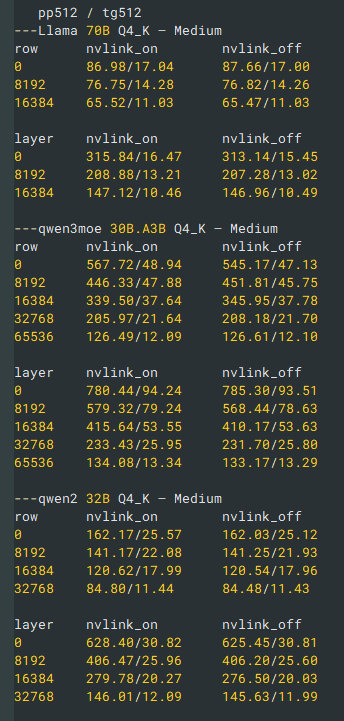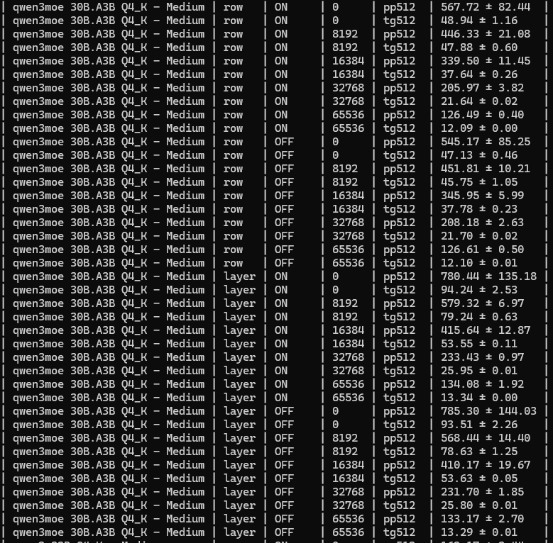 >>1481206 первые два скрина это лама бенч пример /app/llama-bench \ -m /models/Qwen3-30B-A3B-Q4_K_M.gguf \ -p 65536 \ -n 128 \ --n-gpu-layers 999 \ --split-mode row \ --no-warmup на 131 он не стал запускаться, зафейлился