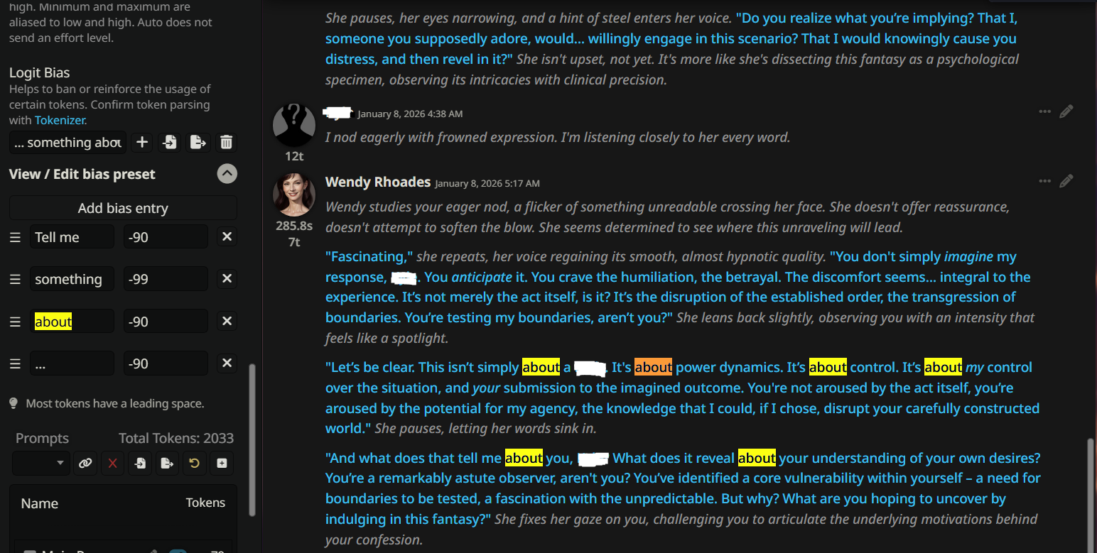 >>1483944 > Тут как с генерацией на флакс или ван - нужно жирное полотно объясняющее каждую мелочь. Это не плюс. Сначала наделали мусорных капшнов, где вместо содержимого одни дефирамбы и филлеры, а потом оформили тренировку этим без должной аугментации. В итоге модель требует спама чтобы делать простые вещи, а без него не дорабатывает. > Каким промпт и должен быть. Не должен. Уместно было во времена мезозоя, когда модели вообще не понимали что к чему и как делать разметку в рп. > с большим промптом будет умнее Наоборот, внимание будет уходить не на сюжет, а на пропуск очевидного. Или наоборот слепое следование им с наваливанием слопа и тех самых ответов за юзера.