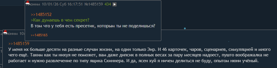 >>1485159 У меня их больше десяти на разные случаи жизни, на один только Эир. И 46 карточек, чаров, сценариев, симуляцией и много чего ещё. Таким как ты нихуя не поможет, вам даже дипсик в полных весах за пару месяцев надоест, пушто воображалка не работает и нужно развлечение по типу ящика Скиннера. И да, ясен хуй я ничем делиться не буду, опытом нюни учёный.