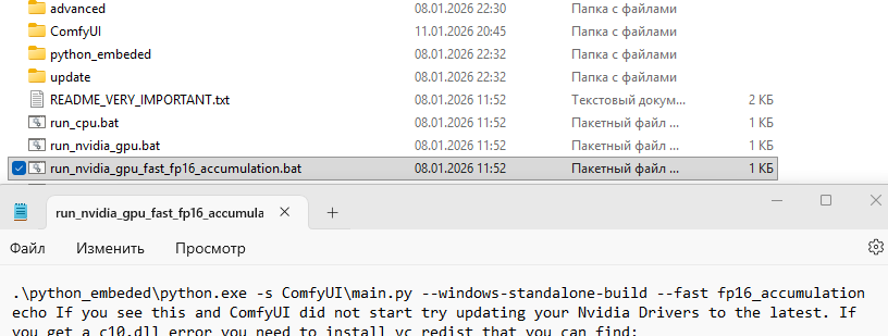 >if you want to enable the fast fp16 accumulation (faster for fp16 modelswith slightly less quality): >run_nvidia_gpu_fast_fp16_accumulation.bat