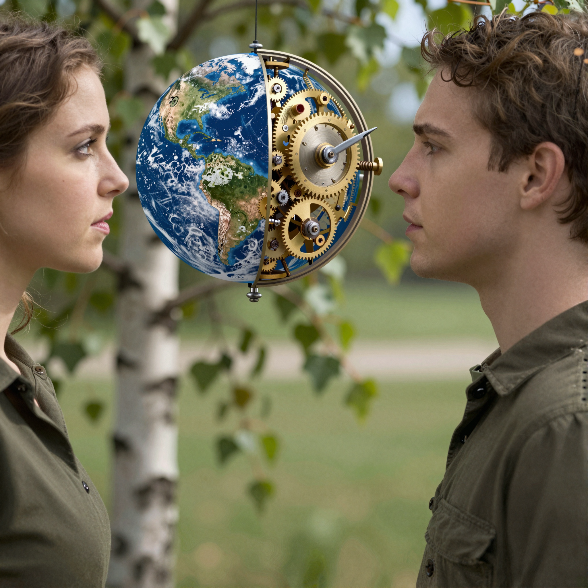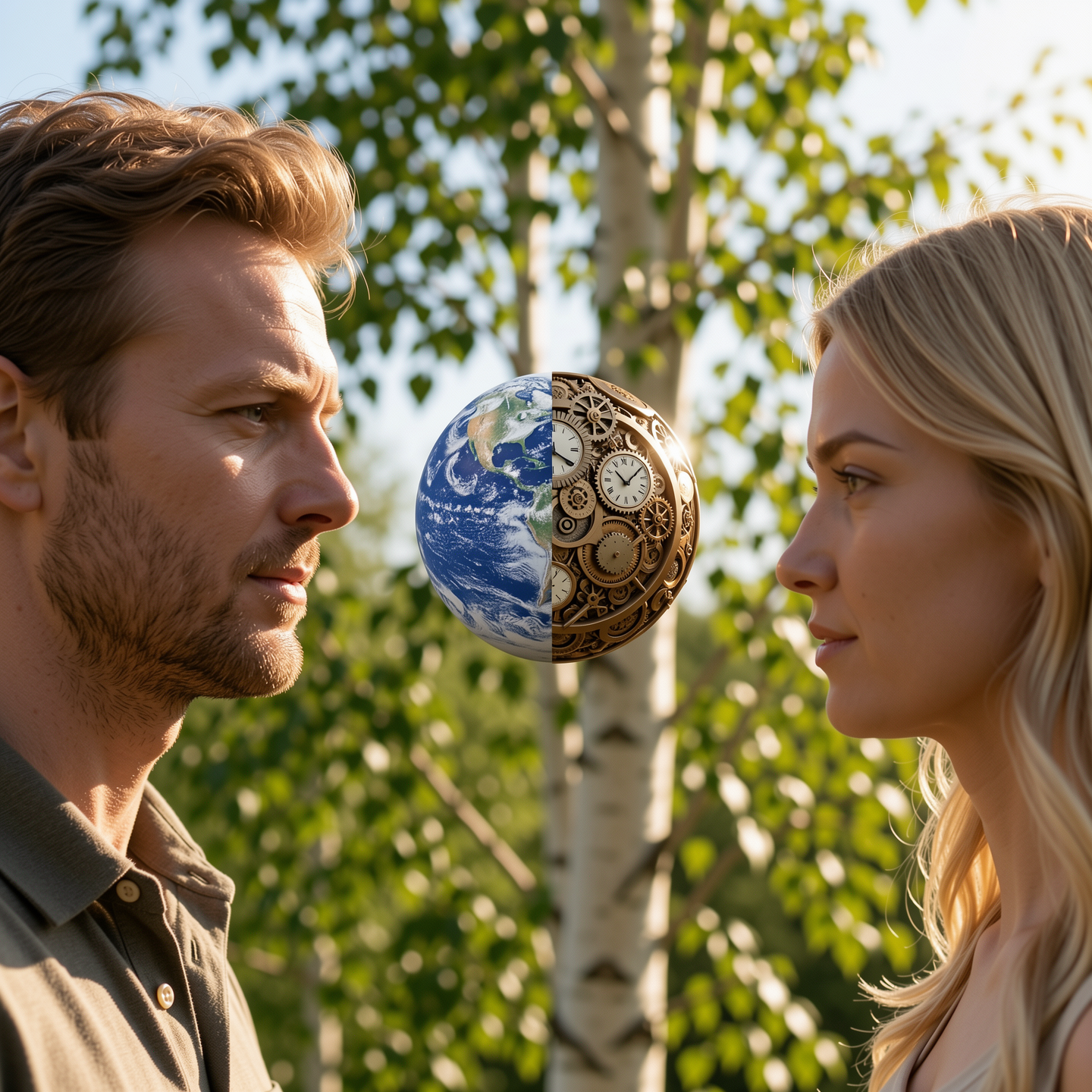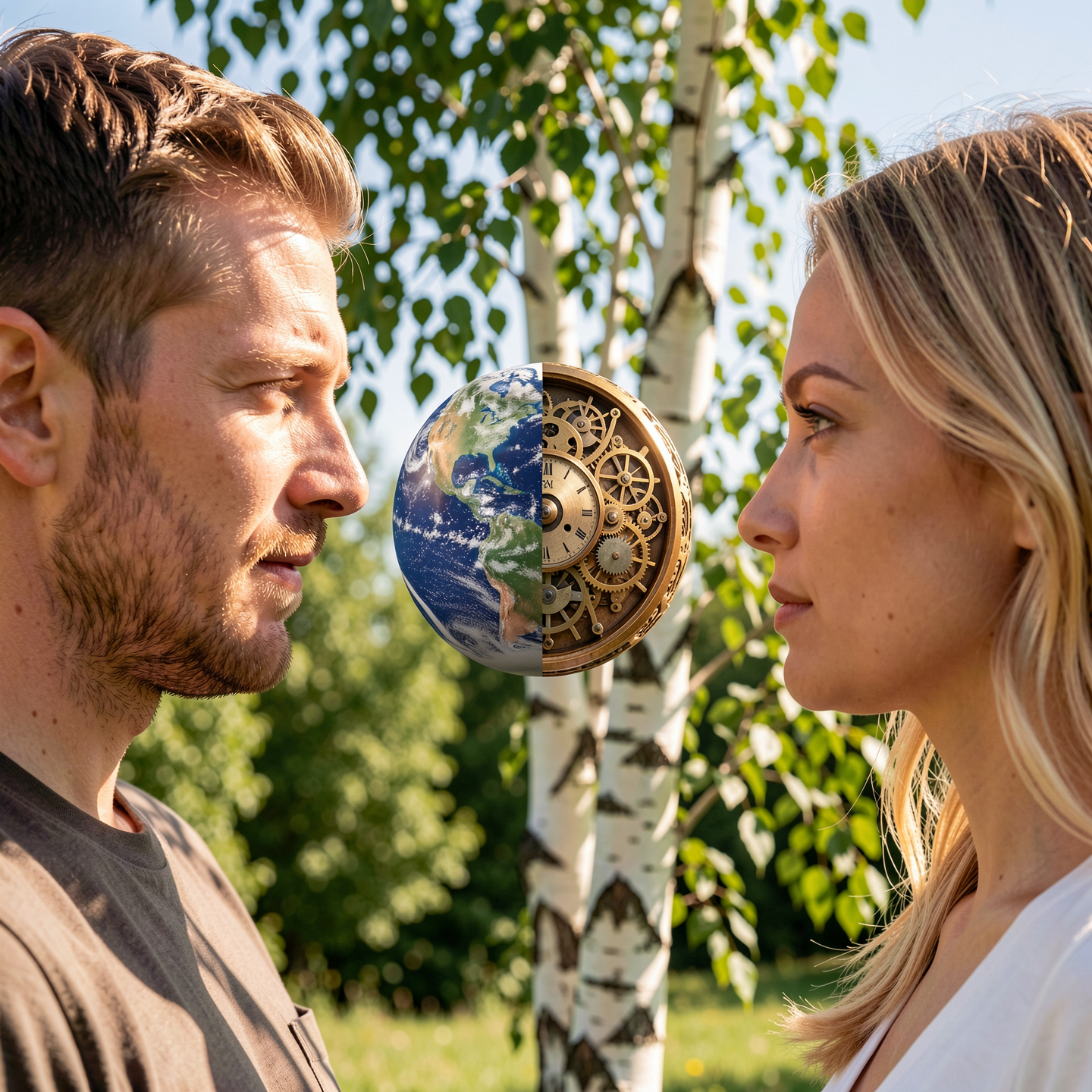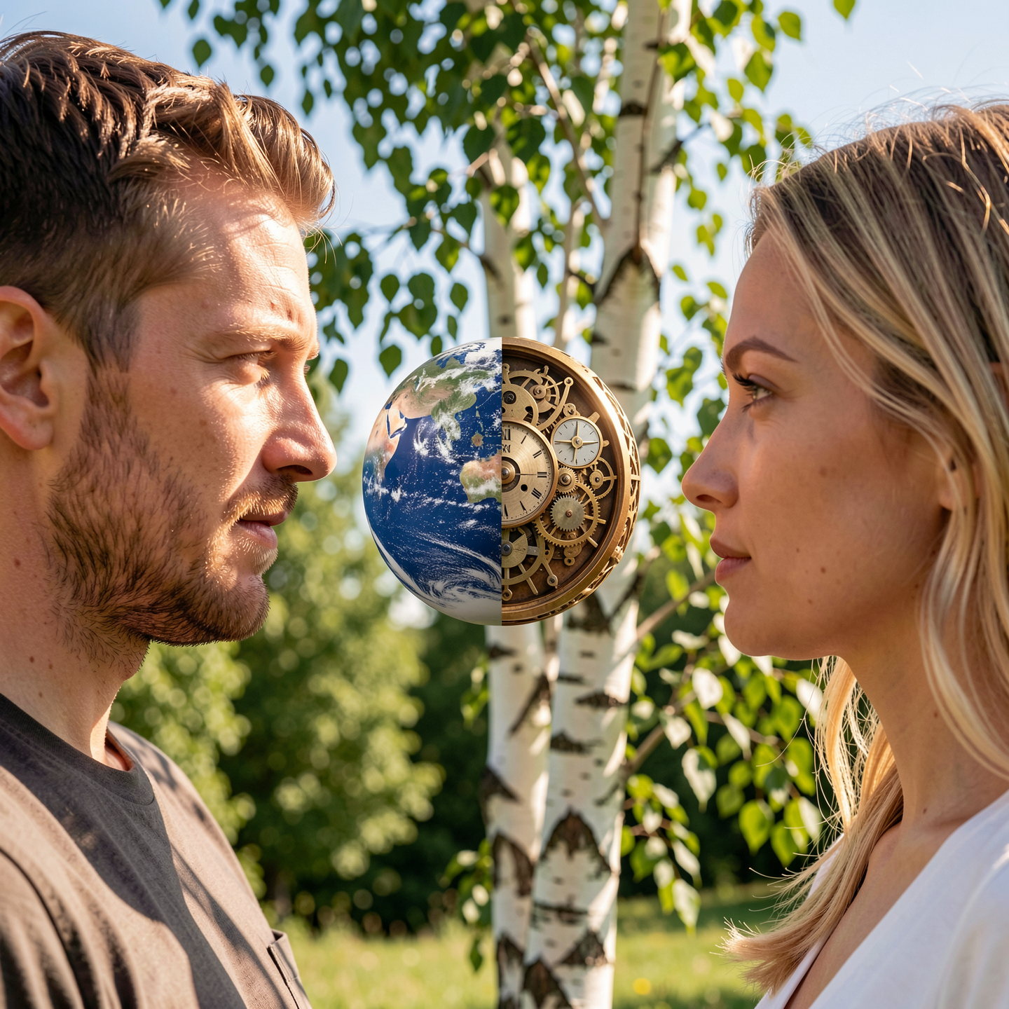 A close-up shot depicting a Caucasian man and a Caucasian woman looking at each other. There is a spherical object hovering between them in the centre of the image, left half of the object is Earth, right half is an intricate clockwork mechanism. There is a birch tree with lush leaves in the foreground. Sunny day. Cinematic lighting. Hyperfocal, deep depth of field.