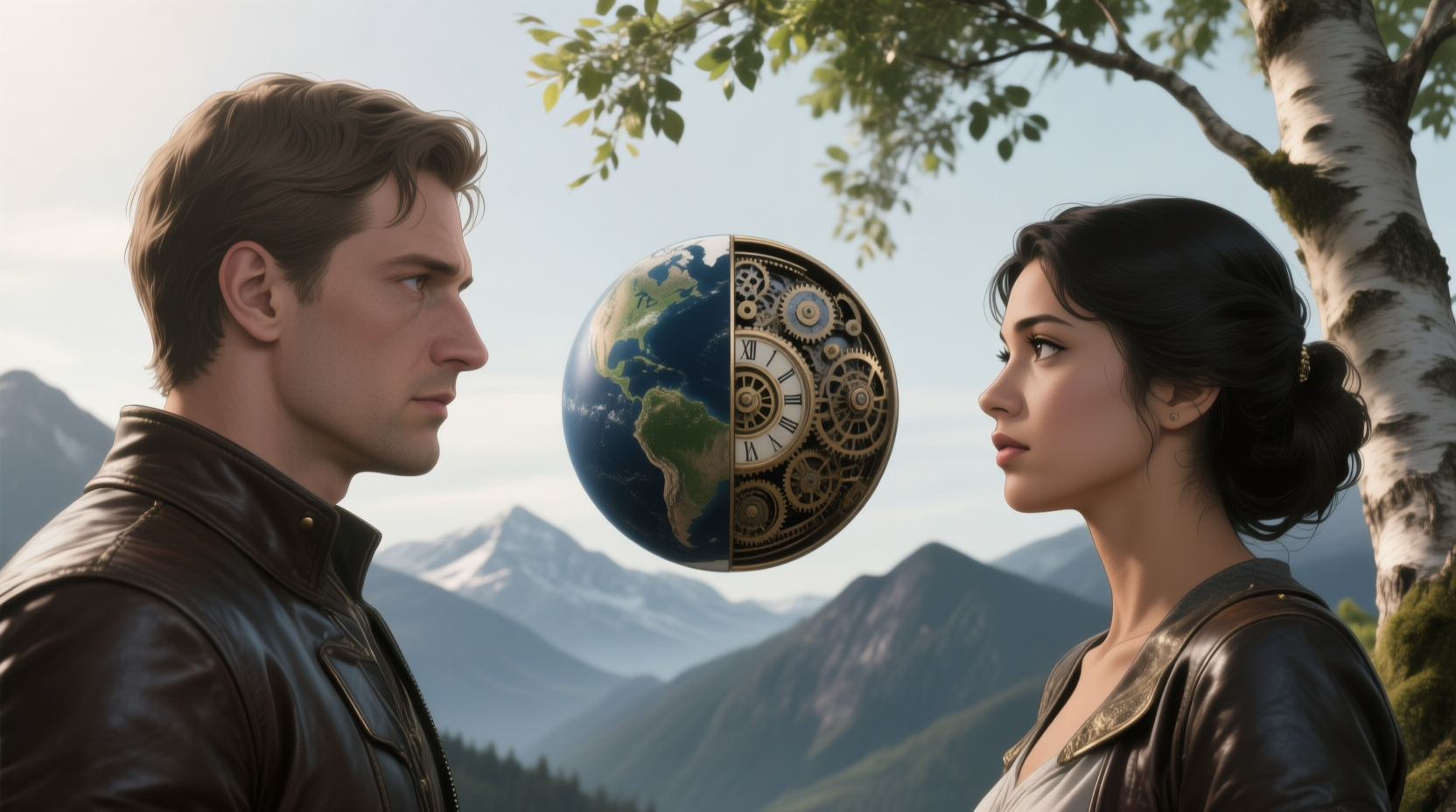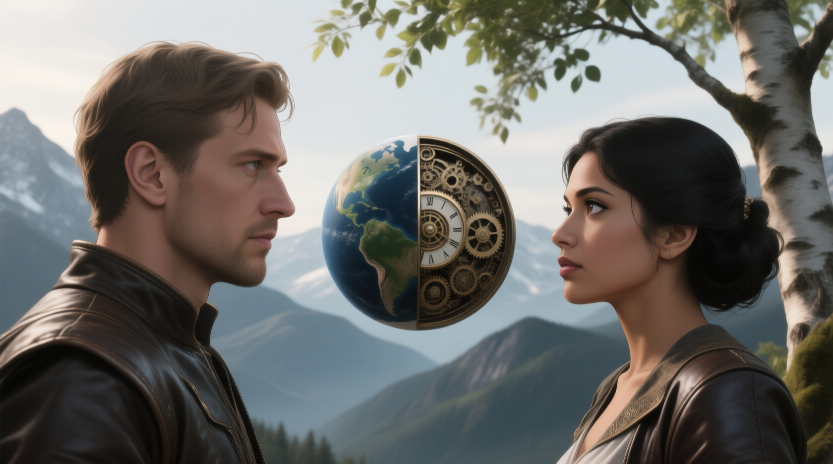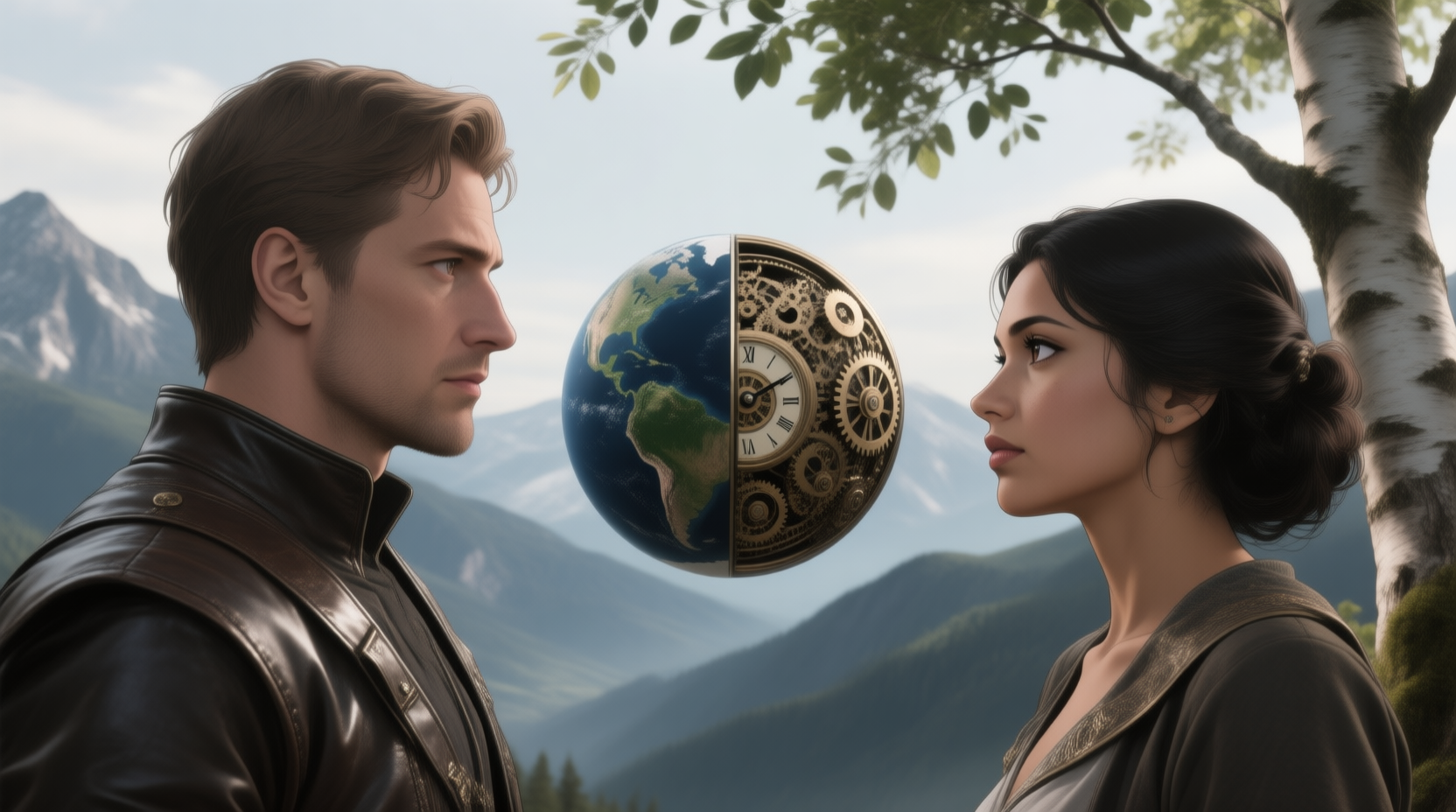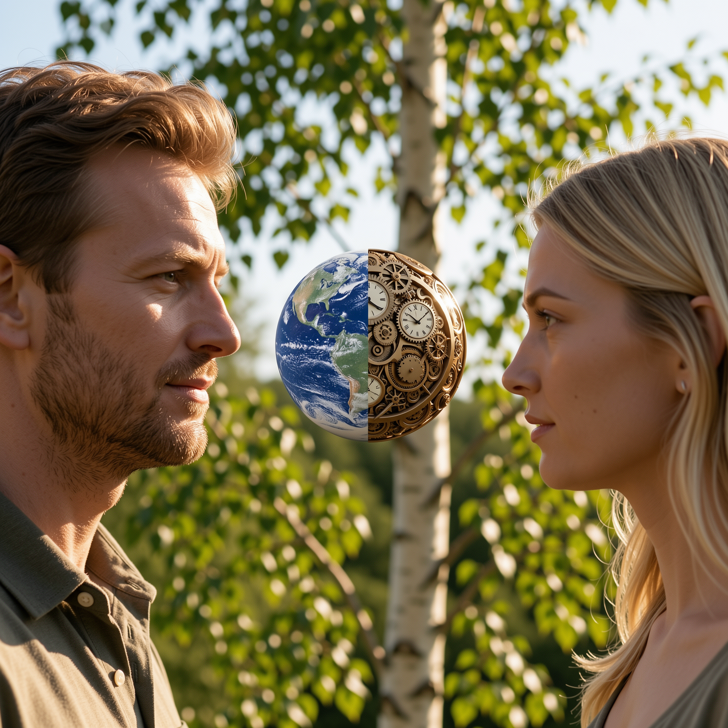 A close-up shot depicting a Caucasian man and a Caucasian woman looking at each other. There is a spherical object hovering between them in the centre of the image, left half of the object is Earth, right half is an intricate clockwork mechanism. There is a birch tree with lush leaves in the foreground. Sunny day. Cinematic lighting. Hyperfocal, deep depth of field.