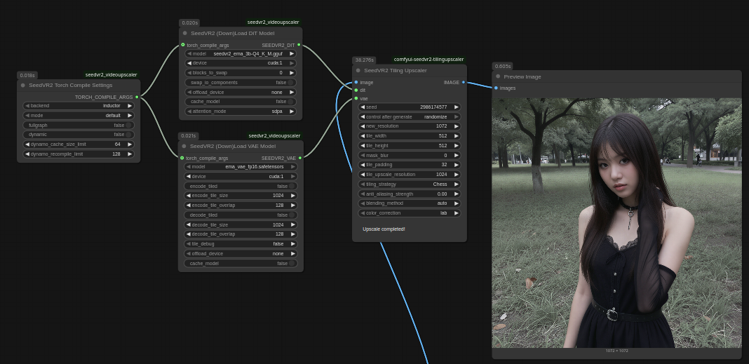>>1486986 >>1487017 Это вот. Оригинал, прогон через SeedVR2, и апскейл до 2048 через него же. Брать через менеджер нод по "SeedVR". При первом запуске оно само нужные для работы модели скачает.