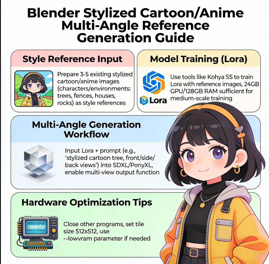 >>1485300 Qwen Edit v1 Turn the 3D rendered scene into a 2D anime illustration: flatten shading, remove micro-details and texture noise, replace soft gradient shadows with 2-3 hard cel-shaded tones, simplify surfaces to clean color blocks, outline outer edges with 3 px solid black line, inner details with 1-2 px colored lines, make eyes larger and sparklier, hair into sharp separated clumps, keep original pose, camera angle, outfit colors and background elements; add slight screen-tone dots on cheeks and subtle white highlight strokes; final look should resemble Kyoto-Animation key-art, 1080p, crisp.